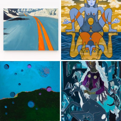 Trulee Hall gathers the myopic histories of her individual mediums, the funny camp quality of craft coupled with desire, pop spirituality, sex, “inappropriateness”—and creates a world where there is no embarrassment in pleasure, no middlebrow finger-wagging, just the push and pull of the picture giving way to other acts: plucking, sucking, gyrating, licking… there doesn’t have to be so many fences between painting and film and sculpture. We can make them all inform one another. We have the technology. Trulee’s work often starts with a painting that then acts as a storyboard for a film. Parts of the films give way to animations, CGI and stop-motion, before coming back to live-action, often with singing and dancing, always with a musical score composed by the artist. Props from the films lead double-lives as sculptures. Actors lead double lives as characters. A set of giant boobs leads a double life as disco balls. She has her colors. She has goddesses. She makes the background dance. This show purposefully mines the gold of new-age clichés, twisting them to funnier and juicier effect. A suite of paintings plays with the forced fantasy relationships we bestow upon animals, the unspeakable subtexts coming out to sun themselves. My favorite is the mermaid on the couch whose fishtail doesn’t even cover her pasty human ass. It’s like being mooned by mother nature. In the next room, an ensemble of tiger paintings depict the sexy beast in equivocal positions with sexy blue-hued women. Each is accompanied by a video. The image of the painting is recreated with live actors. The actors are painted to match the hyperreal colors of the painting. Costume rubber-tongues and paper-mache tiger heads and the incredible, particular bodies of her collaborators bring the images to something more saturated than life. — Christina Catherine Martinez _Acrylic, oil, and collage on canvas with wood frame_ SOLD