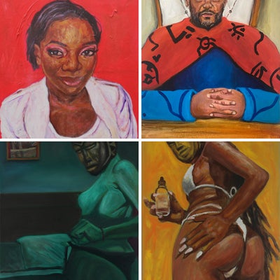 Jay Golding’s figurative paintings and drawings evoke mythology, migration, and interconnectedness, creating literal and symbolic layers employed by vibrant palettes in acrylics and oils, sometimes incorporating collaged or impastoed elements. Golding’s emphasis on tribal cultures within his work, often infuses Caribbean and African cultural motifs allowing him to draw parallels between various communities–expressed by his masked figures and other fictional characters such as the purple-skinned beings from the village “Maji ya bluu”, which is Swahili for blue water. Golding frequently signs his work under the pseudonym Kwame, a name he donned after visiting Ghana in 2019 with his family. He cites his trip to the West African nation as well as Mexico as being life changing and having profound effects on his work.