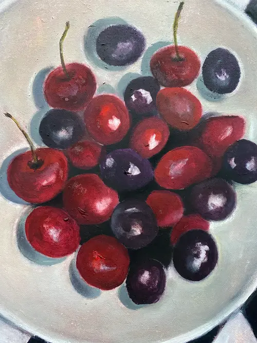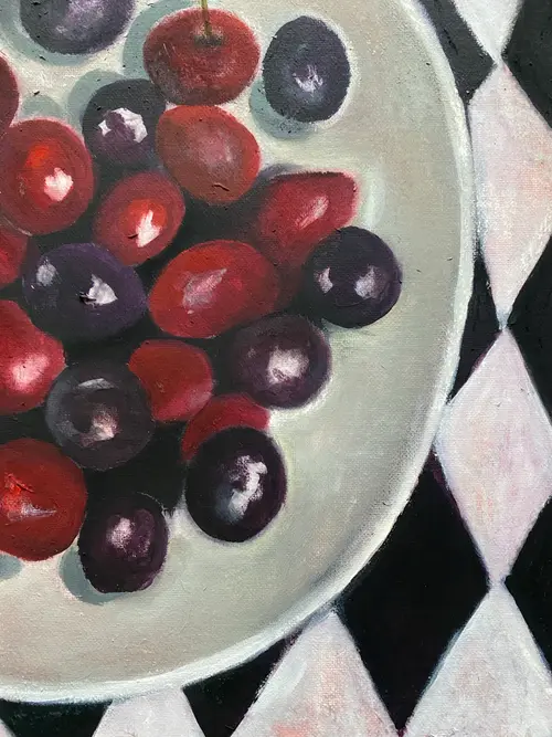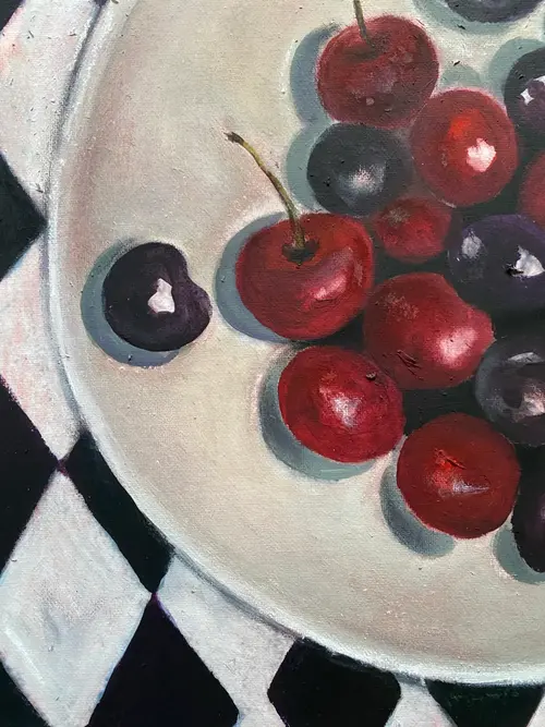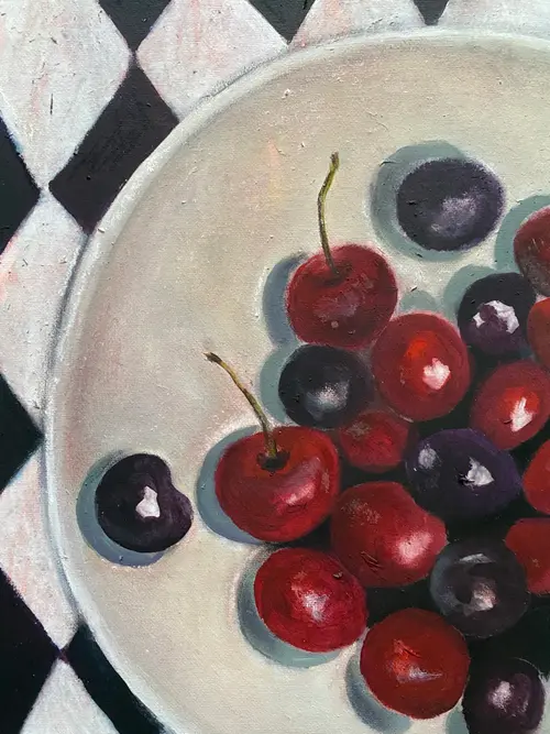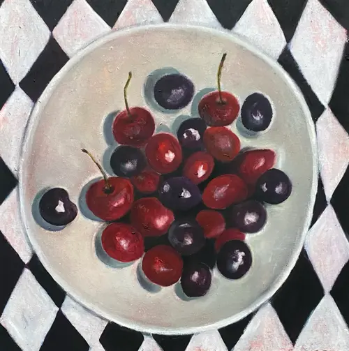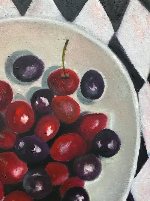 Arles is an original still life painting inspired by the warmth, colour, and quiet intimacy of southern France. Deep red cherries and dark summer fruit rest on a pale ceramic plate set against a bold harlequin tablecloth, evoking the atmosphere of a sunlit café table and the painterly heritage of Provence. The composition balances richness and restraint, allowing colour, shadow, and stillness to create a sense of gentle presence. Painted in acrylic and pastel on canvas panel, the surface reveals soft tonal layering, delicate texture, and luminous highlights across the fruit and patterned ground. A protective varnish enhances depth and preserves the pigments. This is a one-of-a-kind original artwork, signed on the back. Dimensions: 40 × 40 cm. A warm, contemplative still life for collectors drawn to colour, memory, and the quiet poetry of everyday objects.