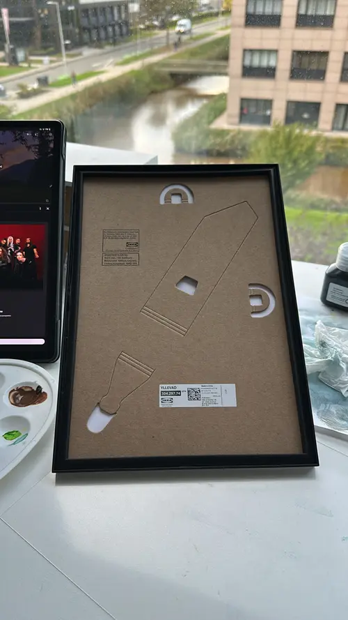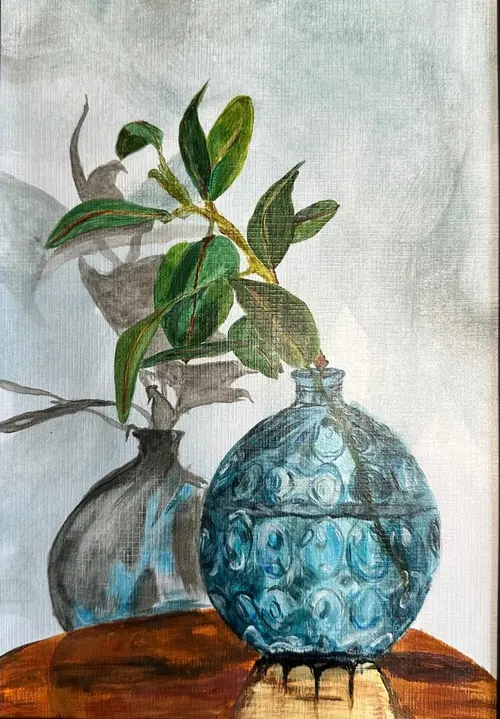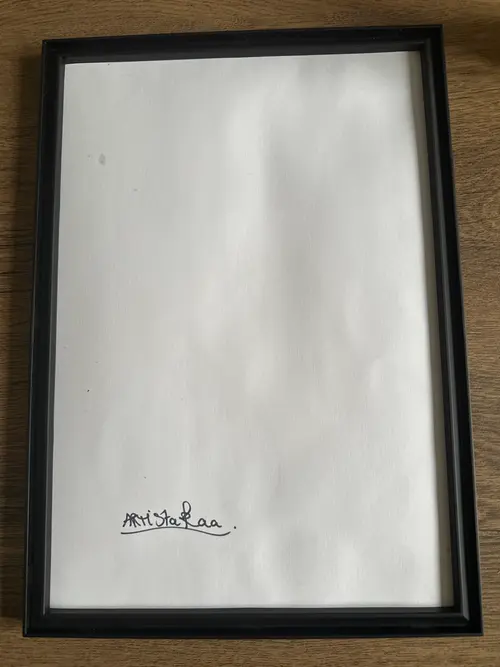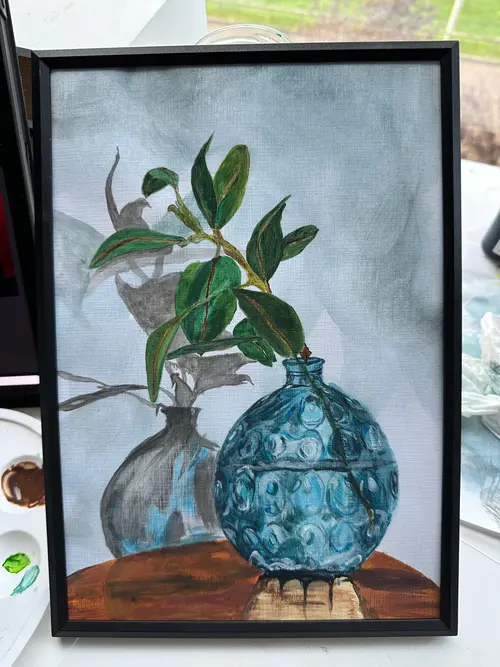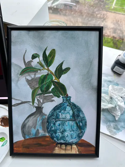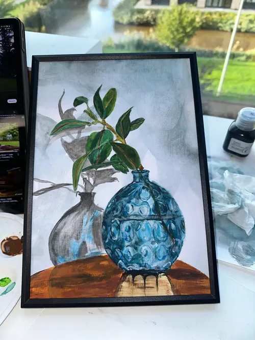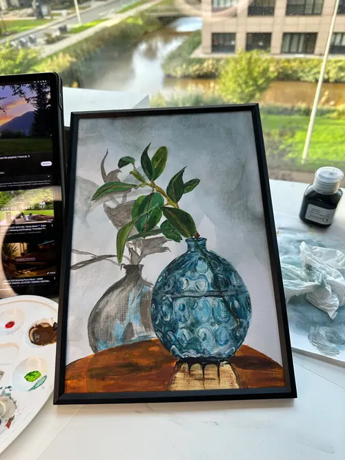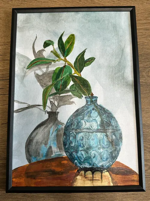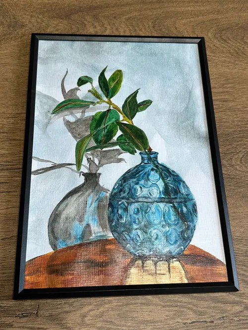 Artwork Information Sheet * Title : Blauwe Schaduw Vaas “Blue Shadow Vase” Still Life with Blue Vase and Green Leaves * Medium: Acrylic Painting, strong acrylic dutch brand by IKEA Sweden. * Subject: A serene still life featuring a decorative blue vase and fresh green leaves on a wooden surface. A timeless piece that adds depth and sophistication to any space. When I drew it, I thought that the glass should not be too realistic, so that the art lover would enjoy it and see the beauty of the painting art, otherwise it would be used with a camera. ⸻ Condition Report The artwork is my origin work , new in excellent condition, with no visible creases, tears, discolouration, or paint loss. The surface looks clean, and the colors are vibrant. The frame is New from IKEA. ⸻ Dimensions • Overall dimensions (including frame): 21 × 30 cm • Image size (interior artwork only): Slightly smaller, due to the frame border (approximately 21 × 29,7 cm) ⸻ Frame Type • Style: Simple, modern, narrow-edge frame • Color: Matte black • Material: Likely wood or composite material with smooth finish • Glazing: Without glass so it does not break during shipping. But you can add it later. ⸻ Technique and Materials • Technique: Hand-painted still life • Materials: Acrylic paint On highly quality paper 350g/m² (Design Sarah Fager - IKEA of Sweden). Varnished with Acrylic Varnish of Van Bleiswijk Holland. • Color palette: Earth tones, blues, greens, white & black to have the grey shades, yellow & red to have the leaf stems and neutral background tones ⸻ Provenance • Origin : [Directly from artist “Artista Kaa”.] ⸻ Damage / Restorations None. ⸻ Shipping / Packaging Recommended shipping method: • Packaging type: Flat-pack in a protective cardboard box with foam corners • Protection: Use acid-free tissue paper over the painting surface, followed by bubble wrap • Carrier: Specialized art courier or tracked standard carrier • Position: Ship upright, clearly marked as FRAGILE