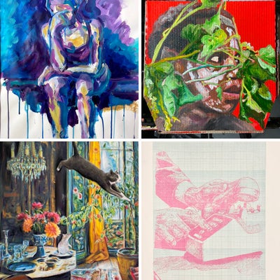 Jay Golding’s figurative paintings and drawings evoke mythology, migration, and interconnectedness, creating literal and symbolic layers employed by vibrant palettes in acrylics and oils, sometimes incorporating collaged or impastoed elements. Golding’s emphasis on tribal cultures within his work, often infuses Caribbean and African cultural motifs allowing him to draw parallels between various communities–expressed by his masked figures and other fictional characters such as the purple-skinned beings from the village “Maji ya bluu”, which is Swahili for blue water. Golding frequently signs his work under the pseudonym Kwame, a name he donned after visiting Ghana in 2019 with his family. He cites his trip to the West African nation as well as Mexico as being life changing and having profound effects on his work.