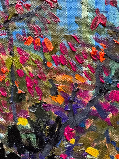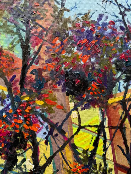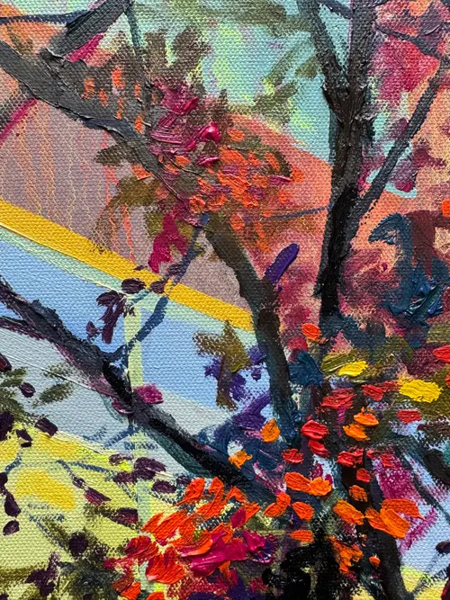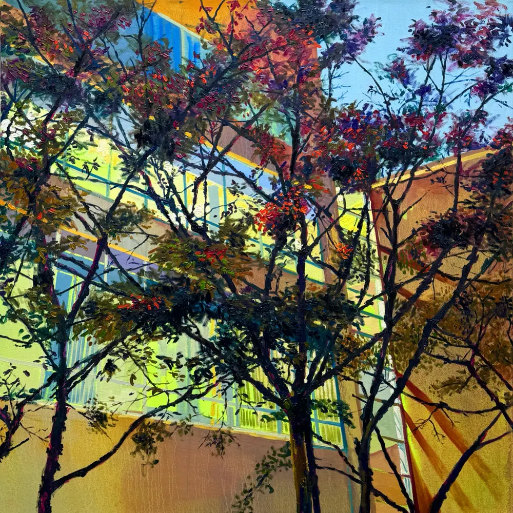 This painting began at a bus stop, in a moment of waiting. The building and trees seemed to radiate with surreal colour, as if the ordinary scene had shifted into something heightened and unreal. At the time, I was moving through a difficult personal period. I wanted this work to hold that emotional weight and transform it into something luminous. Waiting is never neutral. It carries a tension of opposing feelings — anxiousness and excitement, trust and uncertainty, patience and restlessness. This piece sits within that in-between space, where stillness becomes charged and perception begins to shift.