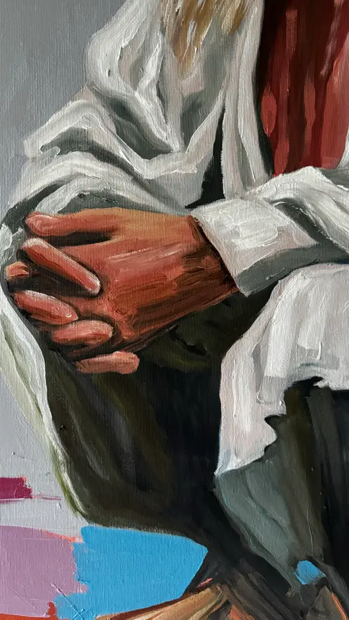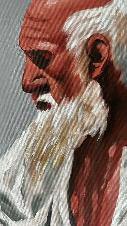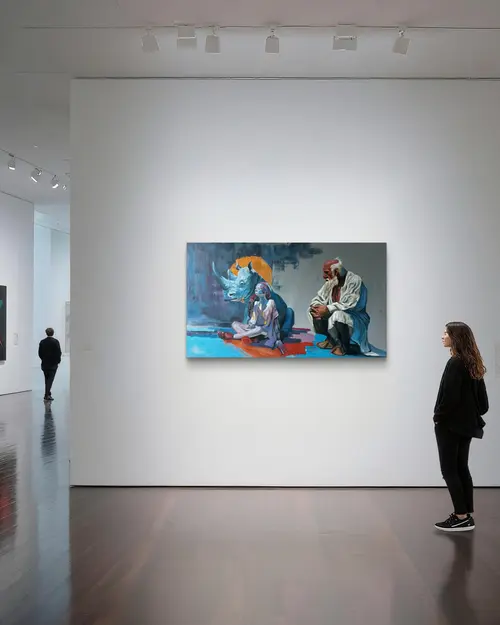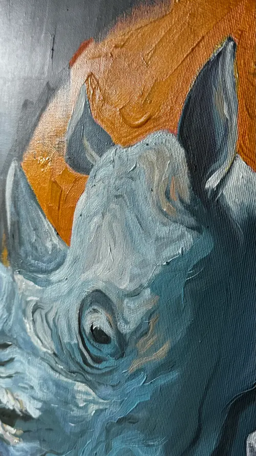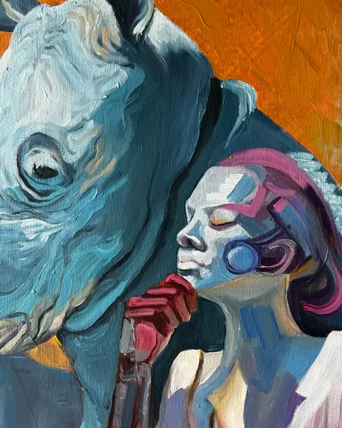 This work reflects on the silent dialogue between past, future, and nature. An elder, heavy with memory, faces a hybrid figure of human and machine, symbolizing what is yet to come. Between them, a rhino stands as an ancient witness — enduring yet fragile. Though close, the figures never meet each other’s gaze. Each remains in solitude, suspended in its own time. The sun behind them binds their worlds into one eternal cycle. Here, humanity unfolds as three dimensions: nature, man, and post-human. The painting asks whether these can truly connect, or whether every generation must live apart, side by side in silence.