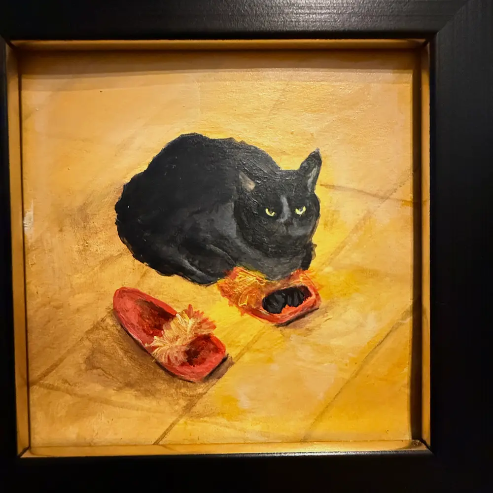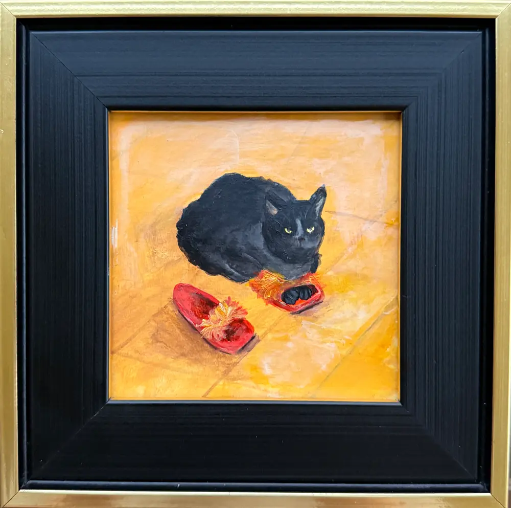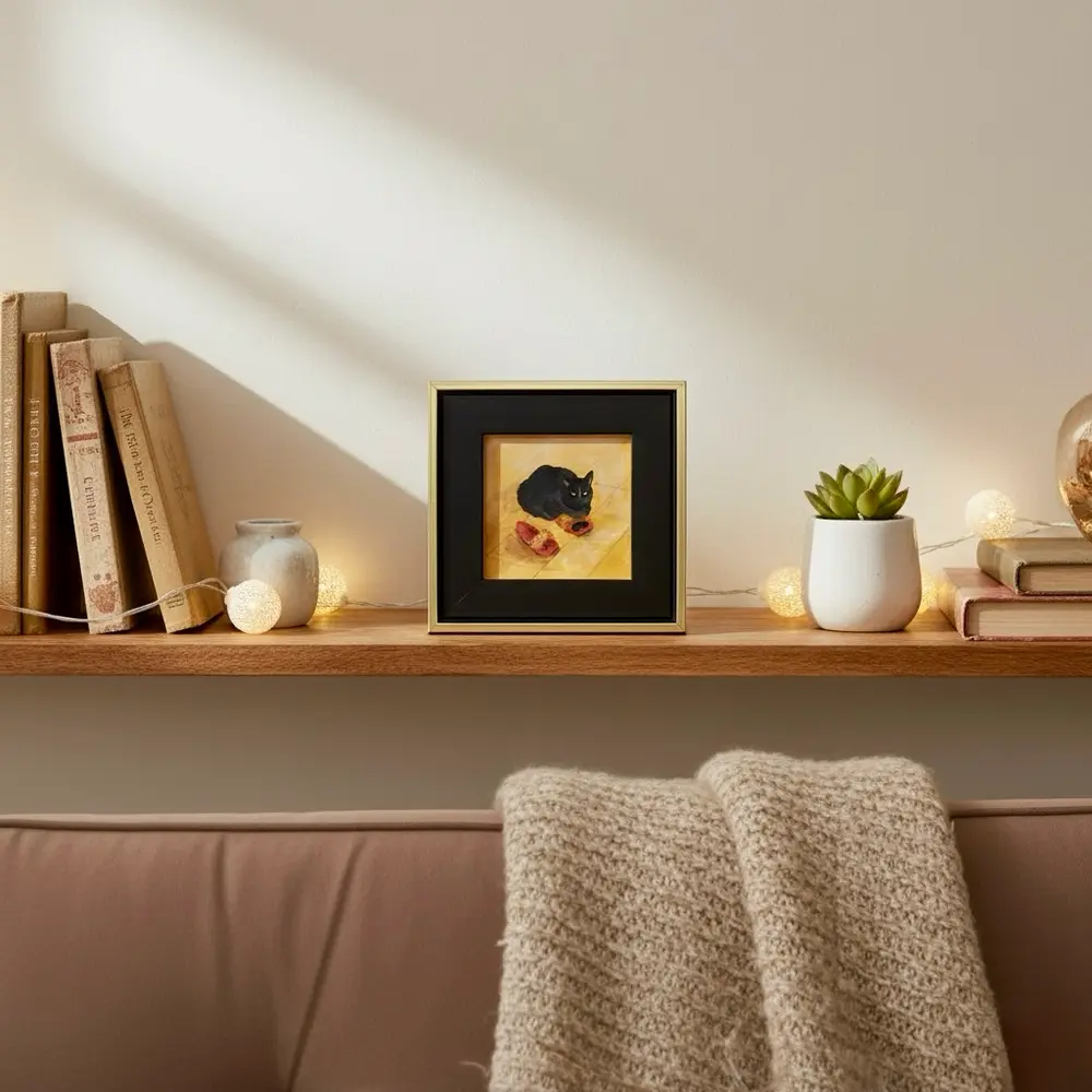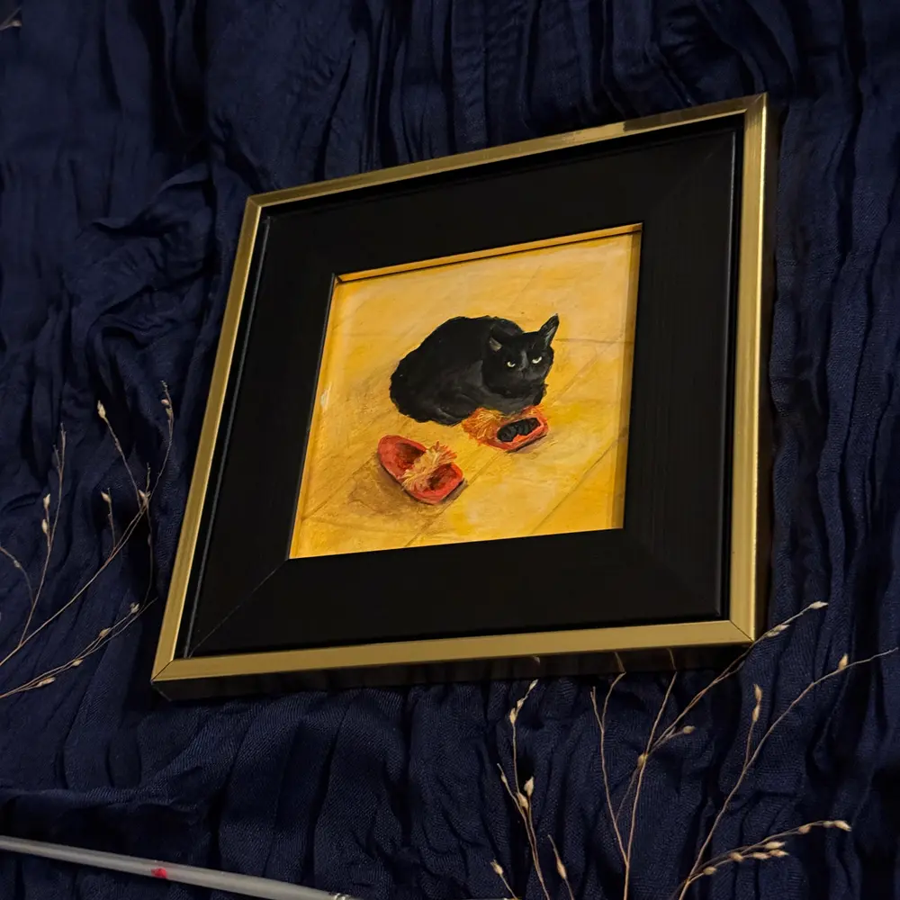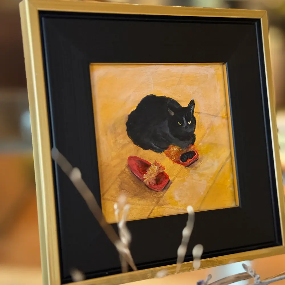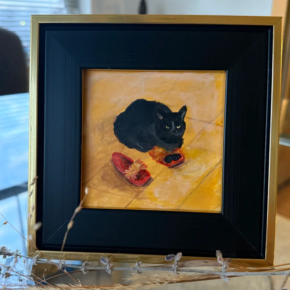 The painting is set in an elegant black frame with a refined gold trim, creating a bold contrast that highlights the vivid colors and expressive character of the cat. Canvas size: 4 × 4 inches Size with frame: 6 × 6 inches Medium: Original oil painting on canvas Frame: Black with gold edging — included and ready to hang or display Perfect for cat lovers, collectors of miniature art, cozy home corners, or as a thoughtful and unique gift. The small size makes it easy to style on a shelf, nightstand, gallery wall, or desk. ✨ Features • ORIGINAL oil painting (not a print) • Vibrant colors and expressive texture • Elegant black-and-gold frame included • Ready to display upon arrival • Ideal gift for cat lovers and miniature art collectors