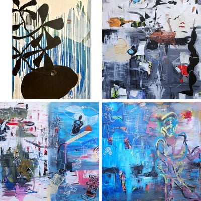 The Chachkies series (in progress) explores random artifacts and figures that inhabit my environment. They fluctuate and blur through layered fields of color and shapes.