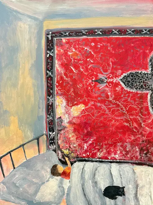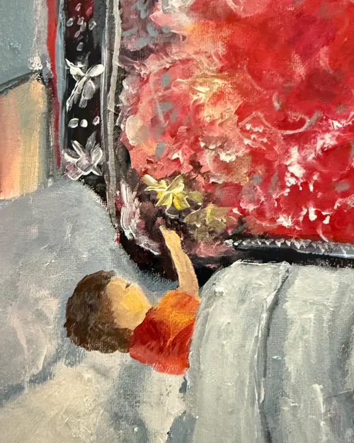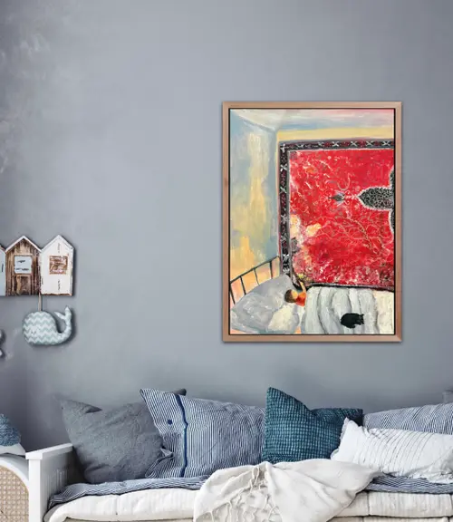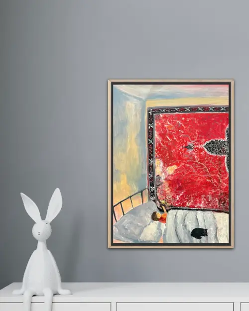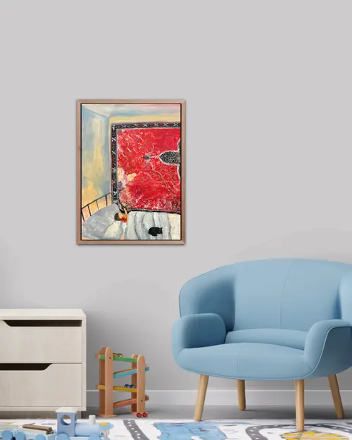 “Childhood” — original acrylic painting on canvas, size 24x18 inches (60x45 cm). This piece captures the warmth and innocence of childhood — a world of dreams, comfort, and quiet wonder. A vivid red carpet fills the room with energy and emotion, while the child and small black cat create a tender, storytelling scene. It’s not just a painting — it’s a memory on canvas, filled with love and nostalgia. Perfect for those who appreciate emotional, soulful art that brings a sense of home and meaning to their space. 🎨 Details: • Original artwork (not a print) • Acrylic on stretched canvas • Size: 24x18 in / 60x45 cm • Signed on the back 🧡 Ideal for a bedroom, reading nook, or living room, where warmth and emotion belong. Makes a thoughtful gift for art lovers who cherish memory and story-driven art.
