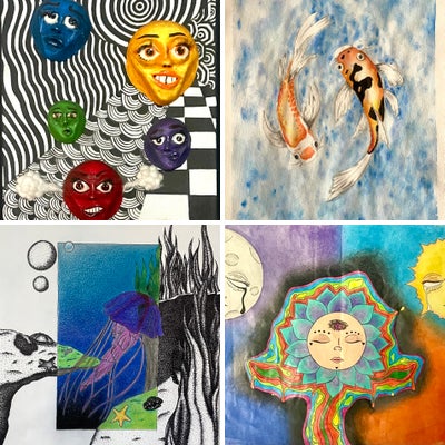 This piece is a vivid and surreal composition, combining sculptural elements with bold graphic patterns. The background is entirely black and white, filled with hypnotic, swirling lines, concentric circles, and geometric shapes like checkerboard tiles and wave-like arcs. These patterns create a sense of motion and depth. In the foreground, five colorful 3D sculpted faces emerge, each with distinct expressions and emotions The yellow face is bright and cheerful, smiling with wide eyes and crooked teeth. The blue face is sad or contemplative, with heavy eyelids and a frown. The green face is mellowed out. The red face is angry, with bared teeth and sharp eyes, accompanied by cotton-like “smoke” or “clouds” puffing out from the sides. The purple face is disinterested or skeptical, with a raised eyebrow and a slouched expression. The black-and-white background contrasts sharply with the vivid colors of the faces, making them pop out as the central focus of the piece. This piece playful yet thought-provoking.