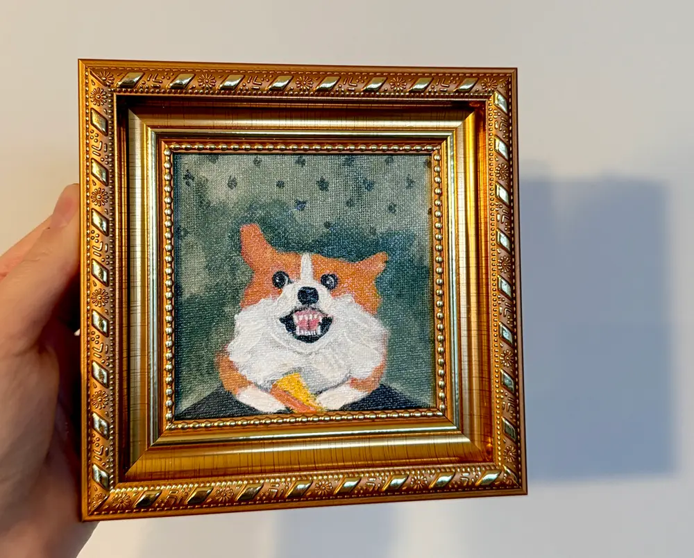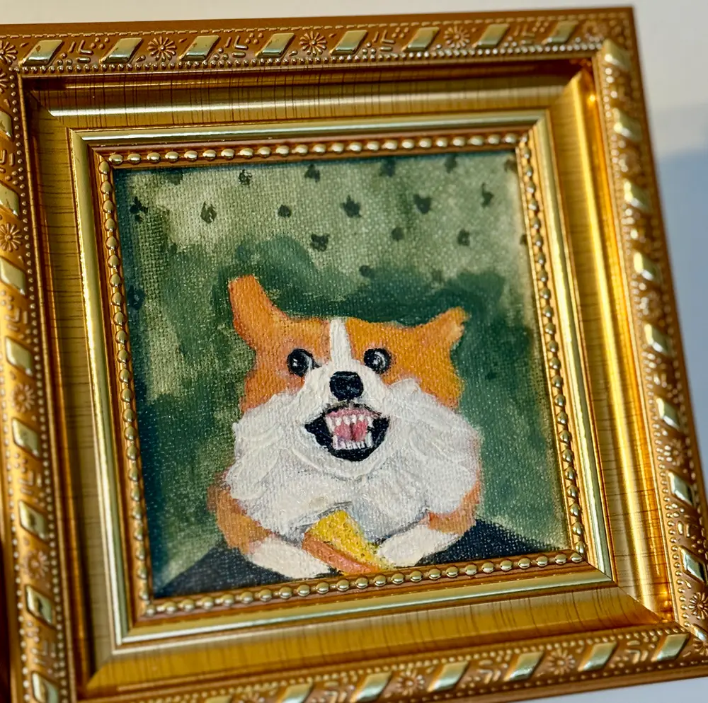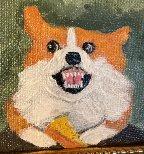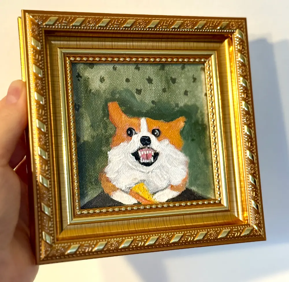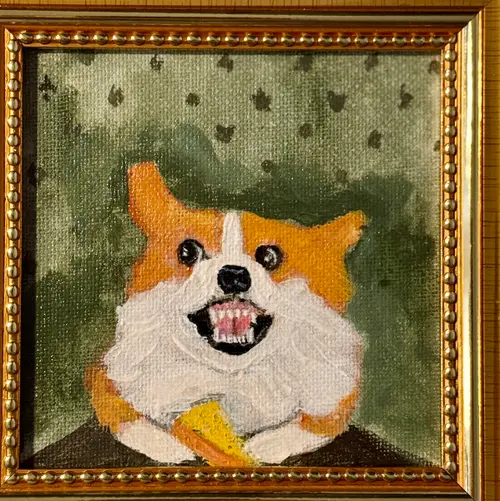 This stunning 4x4-inch original painting depicts a corgi guarding a piece of prey. Hand-painted with acrylics on cardboard canvas and framed in a 5x5-inch wooden frame, this miniature piece is ready to display on a shelf or wall and makes the perfect Thanksgiving, Christmas, or birthday gift for corgi and dog lovers. Every detail is handcrafted, making this painting unique and one-of-a-kind. It's the perfect choice for corgi lovers, art collectors, and anyone looking for a fun and unique handmade gift.