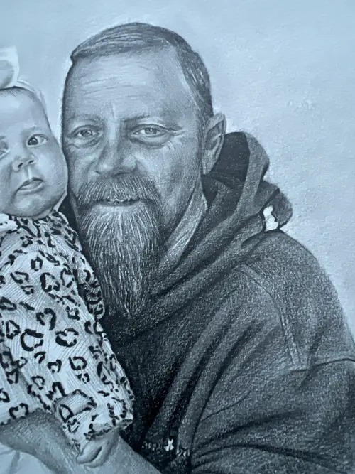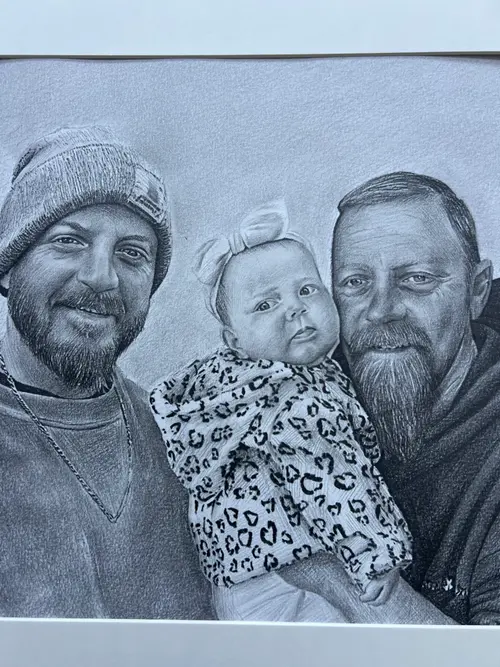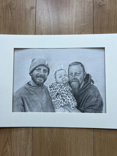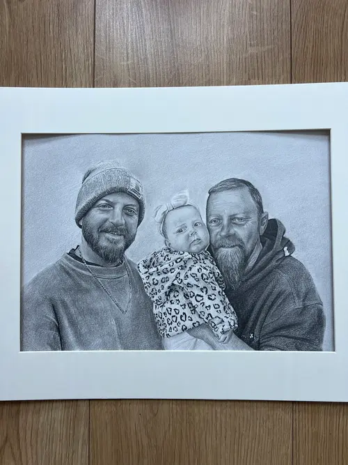 Custom Hyperrealistic Family Portrait – Hand-Drawn Pencil Sketch Celebrate the people who matter most with a bespoke, hyperrealistic family portrait, carefully hand-drawn from your photograph. Each portrait is created using fine graphite pencils, capturing extraordinary detail, depth, and emotion to produce a truly lifelike result. This artwork goes beyond likeness — it preserves connection, love, and shared moments. From subtle facial expressions to natural textures and shadows, every detail is meticulously rendered to reflect the unique bond within your family. The photorealistic style ensures a timeless finish that feels both personal and elegant. Perfect as a meaningful gift for birthdays, anniversaries, weddings, new parents, or memorial keepsakes, this custom portrait becomes a lasting reminder of the people you cherish most. ⸻ What You’ll Receive • A hand-drawn, hyperrealistic pencil portrait • Created from your photo with exceptional attention to detail • Personalised to your family (multiple people can be included) • Signed and dated by the artist • Optional mounting or framing available ⸻ How It Works 1. Place your order 2. Upload a clear, high-resolution photo 3. Your portrait is carefully drawn by hand 4. Final artwork is shipped securely to your door ⸻ Why Choose This Portrait • 100% hand-drawn (no digital tools) • Photo-realistic quality with depth and realism • A one-of-a-kind keepsake created just for you • Crafted with care, patience, and artistic precision