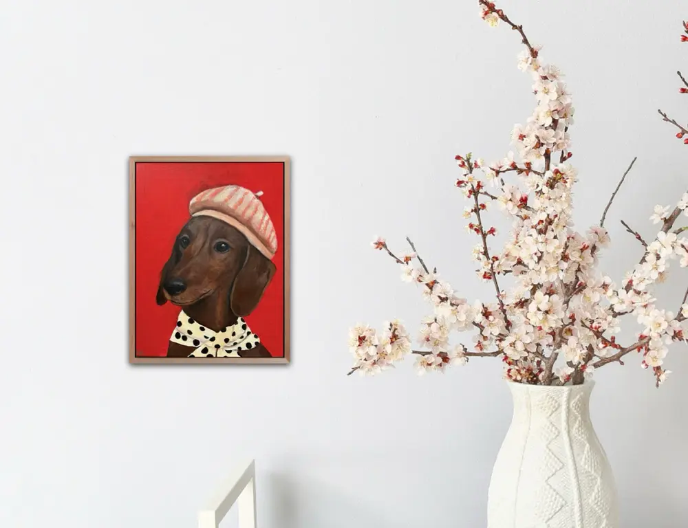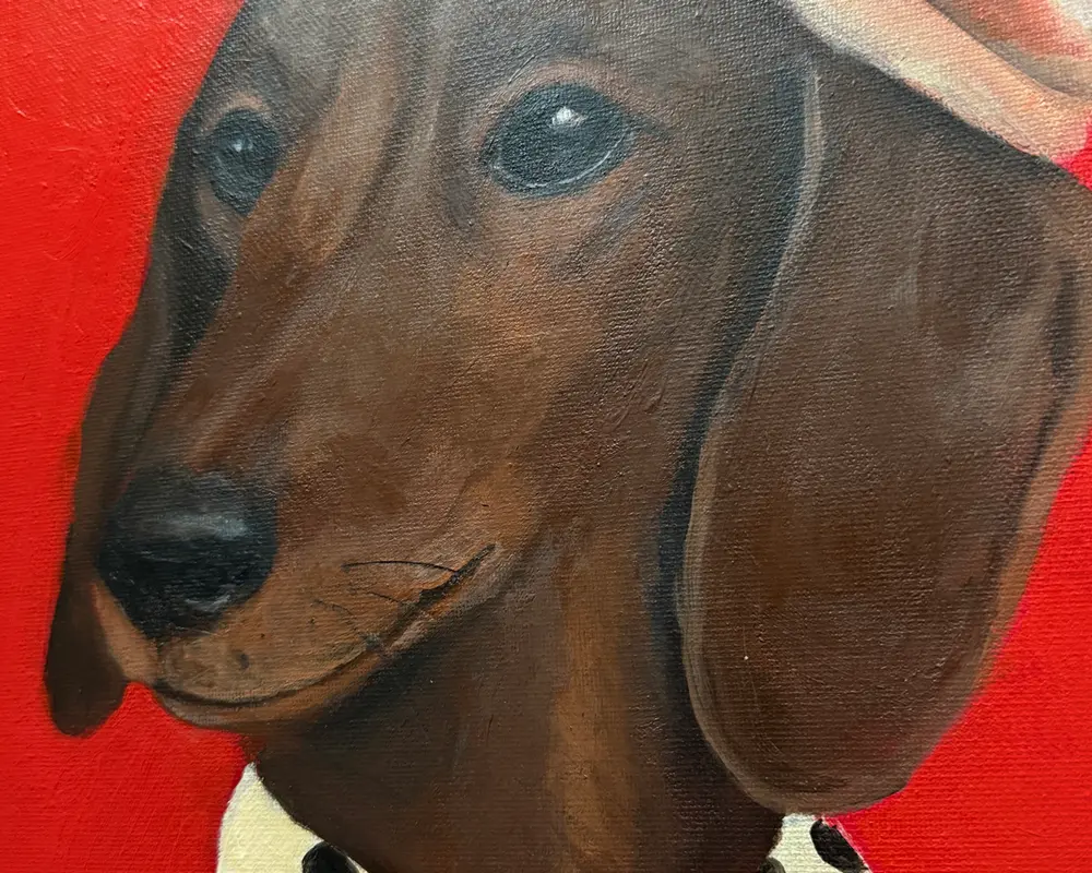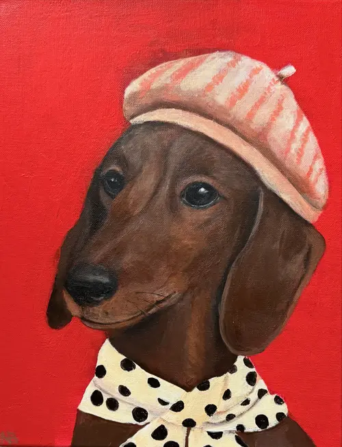 Stylish original dachshund painting — wiener dog in French beret on red canvas. Unique funny dog art, perfect gift for dachshund or dog lovers. 🎨 Details: • Original acrylic painting (not a print) • Size: 11x14 inches • Painted on stretched canvas, ready to hang • Signed by the artist • Vivid red background with fashion-inspired French vibe ✨ Perfect for: • Dog lovers and dachshund owners • French or Parisian-style home decor • Funny and stylish wall art for living room, office, or gift
