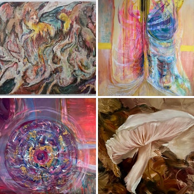 Trusting my intuition, my process starts off automatic by focusing on parts of a song that elicit a visceral response in me. Having Synaesthesia, I see sounds and emotions in the form of shapes and colours. This allows me to easily step into other realms, through depicting the emotions and rhythm of sound that flows through me as I paint. It is a form of introspection, dealing with repressed memories, feelings of hope, longing and guilt. Reflecting on the inner turmoil attached to specific moments in my life, each piece is an extension of myself, as I tell a story of my past in the present. These emotions result in biomorphic surreal landscapes that open up ways for me to heal, by depicting the presence and absence of those lost in these inner realms.