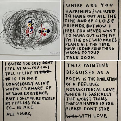 Uribe's work encompasses text, drawing, collage, painting and sculpture, providing a Latin American perspective on the dynamics of domination and power created by Western art historical teaching. Assuming the received narratives but refusing to accept them, Uribe represents them in a way that intersects humor, irony and irreverence towards the dominance and privileges associated with Western canonical works, as well as the cult of their artists. By appropriating and imitating other artists he reveals affection for their work, while at the same time mocking the conventions of contemporary gallery culture and the expectations of the public.