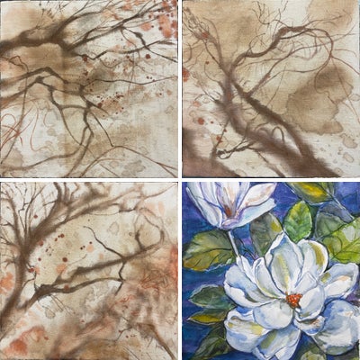 This work was inspired by the trees outside my studio window at the Helene Wurlitzer Foundation in Taos, NM. I was fascinated by the often curly branches and layered forms. Materials include natural dye, and walnut inks on canvas mounted to a wood panel.