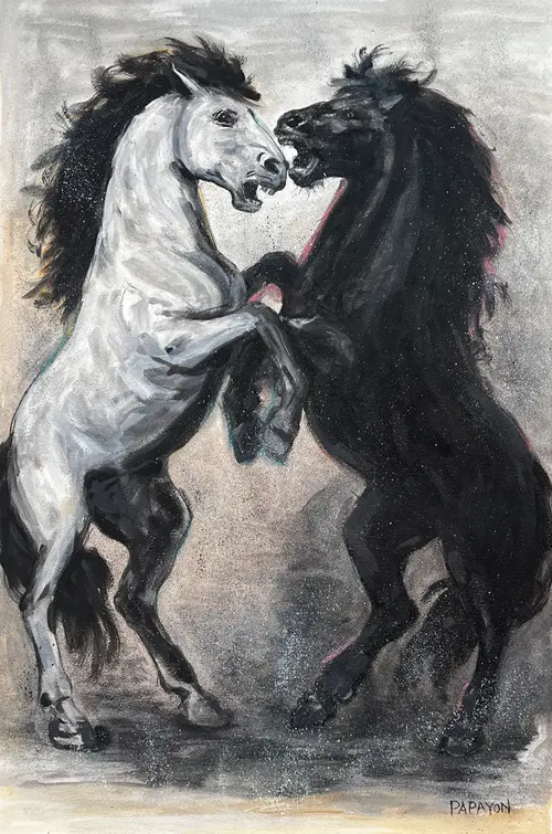A visceral confrontation frozen in motion — two stallions rear, clash, and claim space within a storm of pigment and powdered chaos. The classic contrast of black and white dissolves into movement and emotion, blurring notions of duality, dominance, and instinct. Rendered in oil and mixed media on cotton paper, Dust and Thunder captures not just a battle, but a ritual — primal, cyclical, and unresolvable.