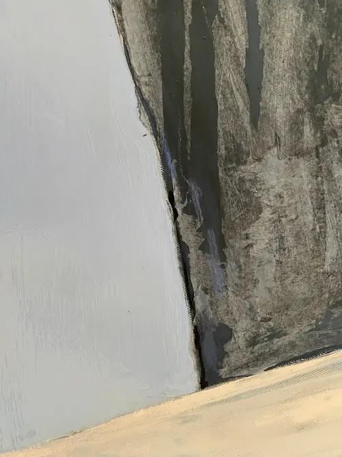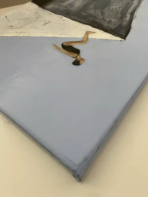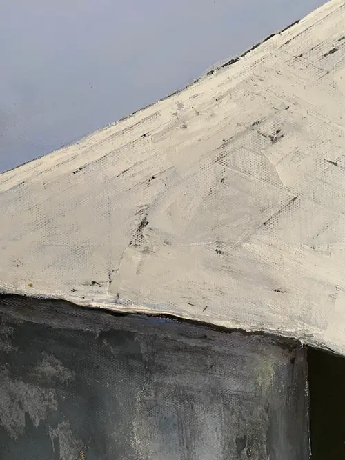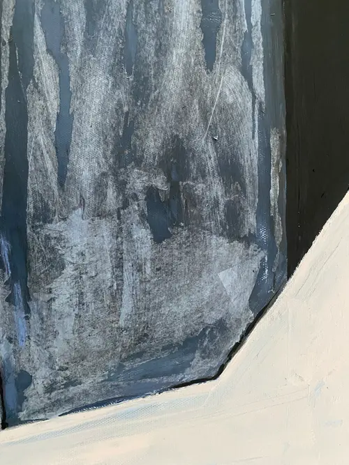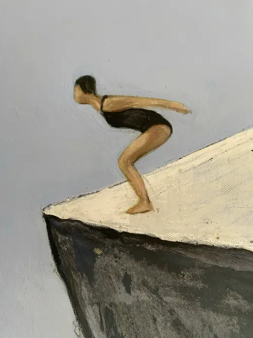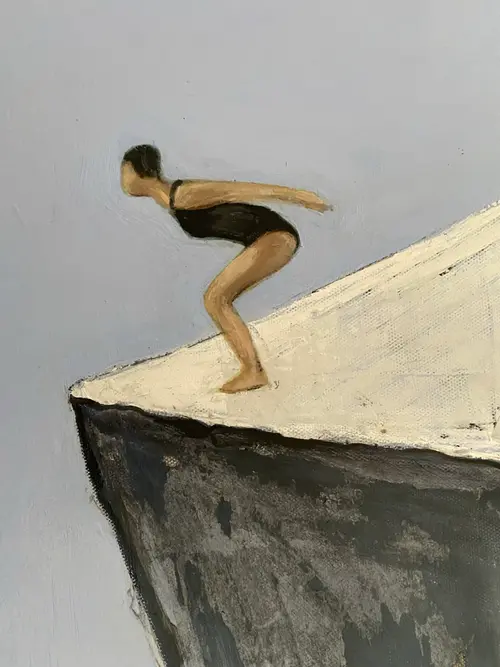 Edge of the World is an original figurative painting exploring balance, stillness, and the fragile moment before movement. A solitary swimmer stands poised on the sharp edge of an architectural cliff, suspended between gravity and sky. The restrained palette and quiet spatial tension create a contemplative atmosphere, allowing light, silence, and emotional distance to shape the experience of the image. Painted in acrylic and pastel on stretched canvas, the surface carries layered tonal depth, subtle texture, and expressive painterly variation. A protective varnish enhances the richness of the pigments and preserves the work. This is a one-of-a-kind original artwork, signed on the back. Dimensions: 40 × 79 cm (vertical format). A meditative contemporary figurative painting for collectors drawn to solitude, architectural space, and the quiet edge between fear and possibility.