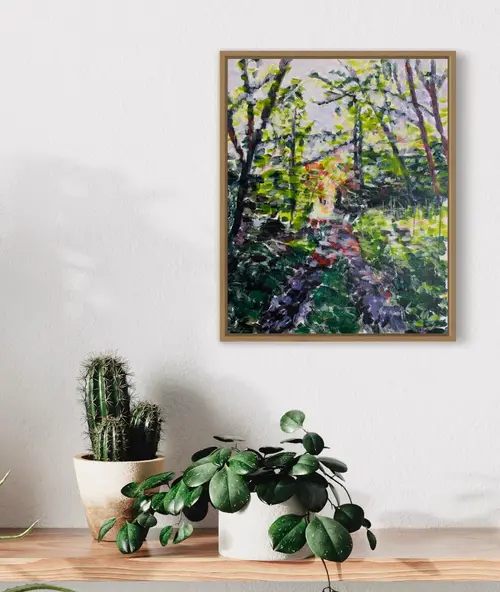 Radiating warmth and light, my painting is intended to evoke a sense of magic and nostalgia. Includes a natural wood floating frame.