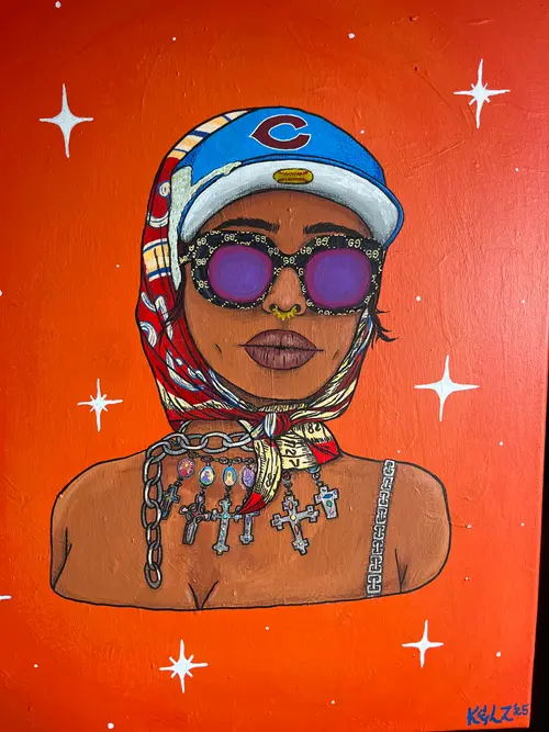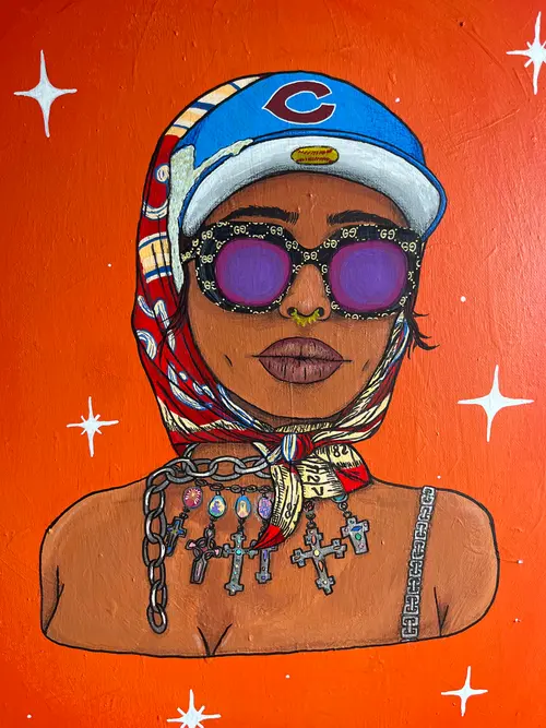 This piece is a fashion-inspired piece full of luxury-themed detailing such as the Gucci glasses, the Cincinnati Reds blue jean hat, the silk scarf and the chunky silver necklaces with rosary crosses.