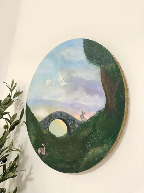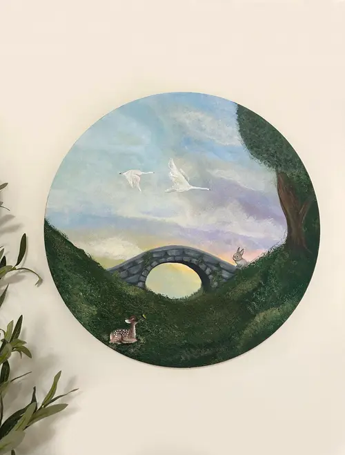 Forest heaven is a calm round with golden edges sunrise painting of nature and forest animals