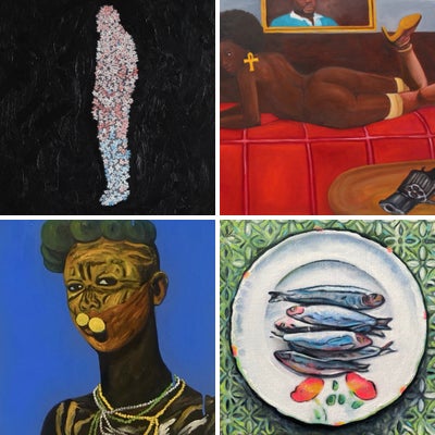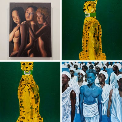 Jay Golding’s figurative paintings and drawings evoke mythology, migration, and interconnectedness, creating literal and symbolic layers employed by vibrant palettes in acrylics and oils, sometimes incorporating collaged or impastoed elements. Golding’s emphasis on tribal cultures within his work, often infuses Caribbean and African cultural motifs allowing him to draw parallels between various communities–expressed by his masked figures and other fictional characters such as the purple-skinned beings from the village “Maji ya bluu”, which is Swahili for blue water. Golding frequently signs his work under the pseudonym Kwame, a name he donned after visiting Ghana in 2019 with his family. He cites his trip to the West African nation as well as Mexico as being life changing and having profound effects on his work.