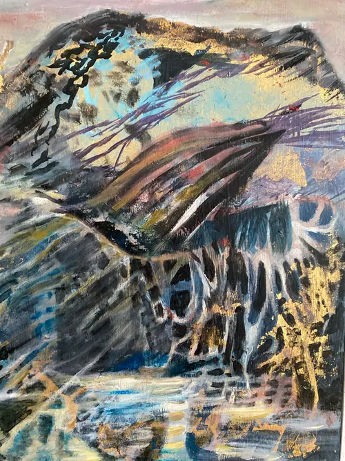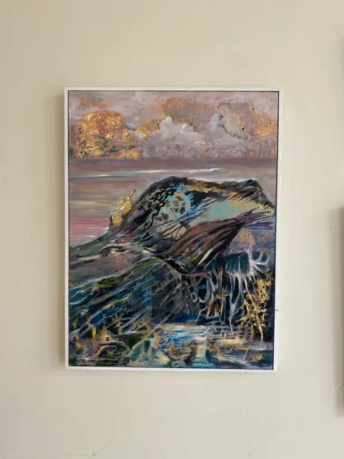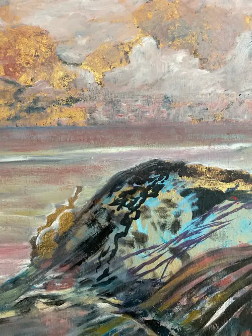 I’m a contemporary artist most interested in painting and drawing otherworldly landscapes using memories, thoughts and feelings. In my practise I like to create otherworldly images of nature through different mediums like acrylic paint and oil pastels. Having started my career working solely in teaching, championing the importance of creativity in the curriculum , I am now fulfilling my own craving for creativity through my work as a visual artist. I specialised in printmaking as part of my fine art degree in Newcastle, graduating in the early 1990s. Drawing on my printmaking background- in particular cutting away at Lino- I love making intricate patterns through paints and oil pastels. I want the colours to compliment each other so I often use a limited palette -one of each of the primary colours and a black and a white. I take inspiration from fluid lines and mark making of Korean art, which is defined by its quiet inner harmony. I also love Manga and Matisse! Taking a magical realistic approach, I create ephemeral landscapes and seascapes. It’s my way of expressing my longing for lost memories and lost loved ones. I feel close to them during the act of painting. Working late into the evening I reflect back on my day. My paintings and oil pastels often tell me how I’m feeling and answer the question of what type of day it has been. Becoming engrossed in the act of creating is cathartic. I really believe in the therapeutic potential of art for both maker and viewer. I remember reading somewhere that looking at art can extend your life! I take an intuitive approach and the element of surprise makes creating art fulfilling and exciting. Feeling my way through a piece until I am happy with its visual energy fires up my brain. Titles act as the final piece of the jigsaw puzzle.