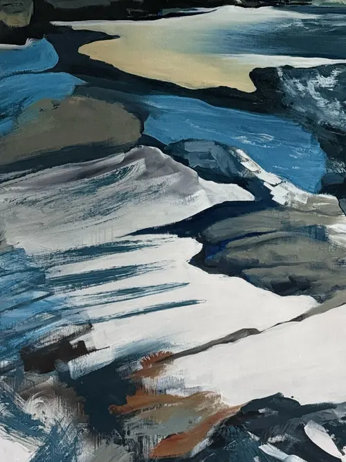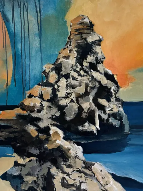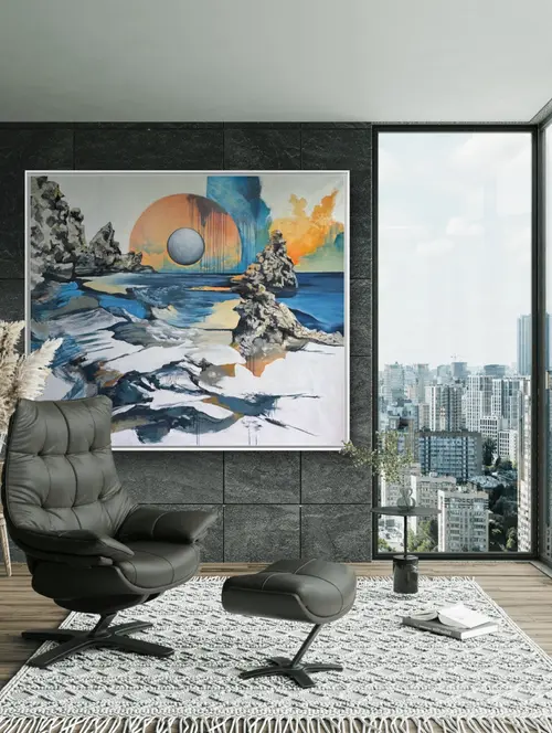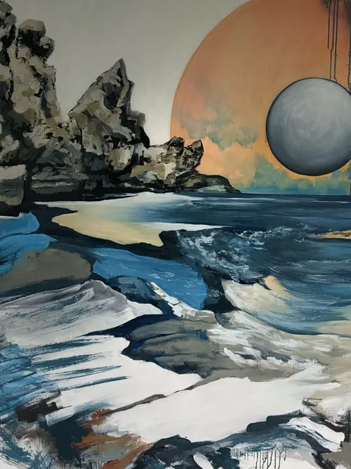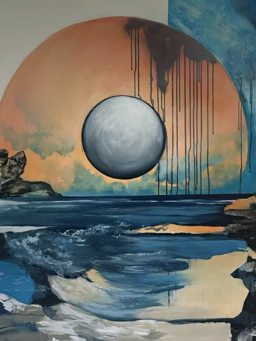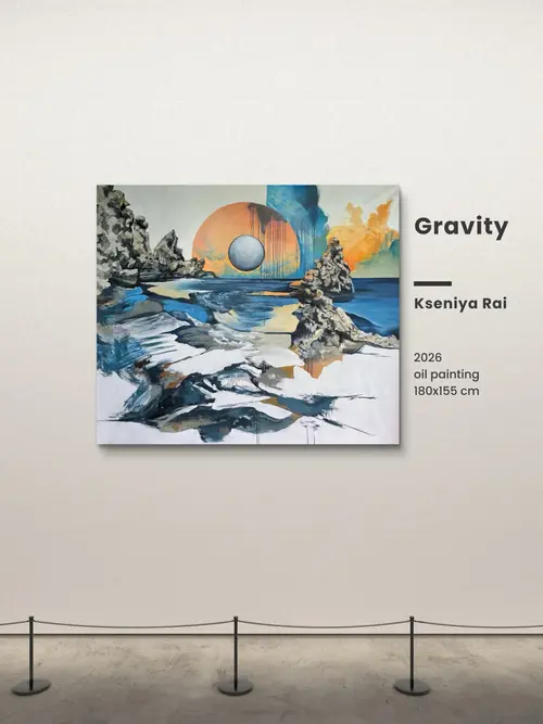 “Gravity” — Kseniya Rai Oil on canvas, 180 × 155 cm, 2026 From the series Zero Thinking “Gravity” examines the moment when form begins to yield — not abruptly, but almost imperceptibly. The work exists in a state of quiet transition, where stability and dissolution overlap. A suspended sphere anchors the composition, holding a fragile balance between presence and fall. Around it, the landscape shifts: rock formations fracture, surfaces soften, pigment flows downward. Gravity becomes visible — not as force, but as process. The horizon remains calm, almost untouched, suggesting a parallel state of stillness. This contrast creates a tension between what is held and what is already in motion. Within this space, opposites do not conflict — they coexist. Structure and erosion. Control and release. Silence and movement. In the Zero Thinking series, this work reflects a state beyond decision, where perception is no longer filtered through analysis. What remains is a direct experience of change — continuous, unresolved, and open. Nothing resists. Nothing insists. Everything moves as it must.