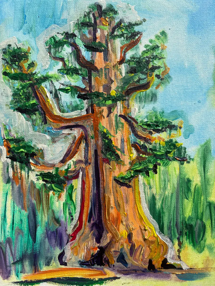 Named "Grizzly Giant," 3000 yr. old 64m tall Sequoia tree- icon of the ancient Mariposa Grove painted on site in the breathtaking Yosemite NP!