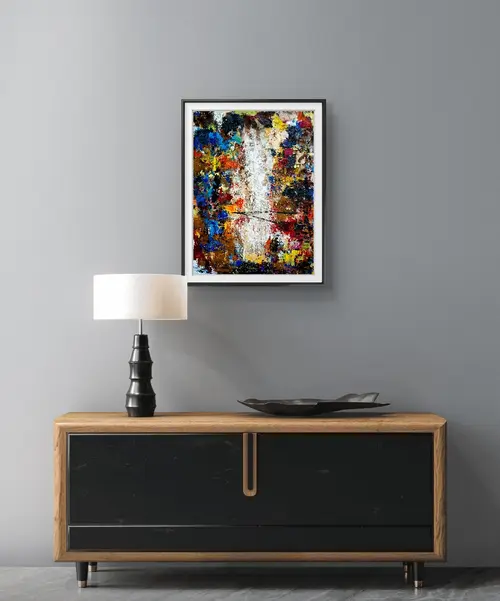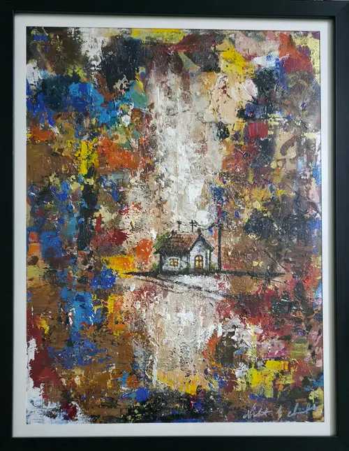This painting portrays a small, illuminated house standing fragile amid a storm of textures and intense colors. The surrounding chaos emphasizes the vulnerability of safety, while the house represents a brief refuge. The work reflects the tension between stability and unpredictability, showing that moments of shelter exist even in overwhelming circumstances.