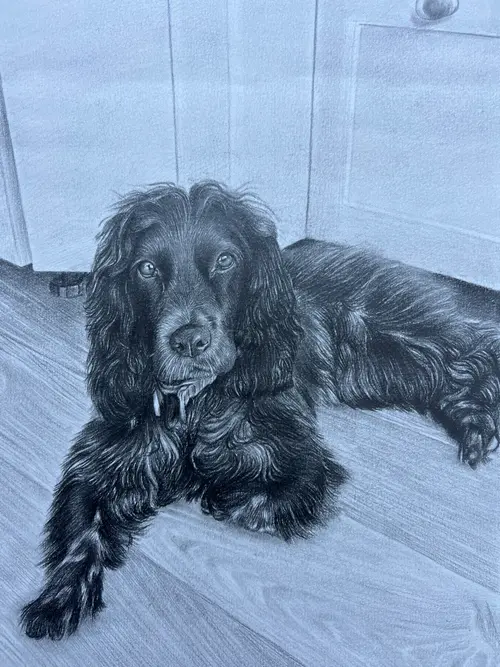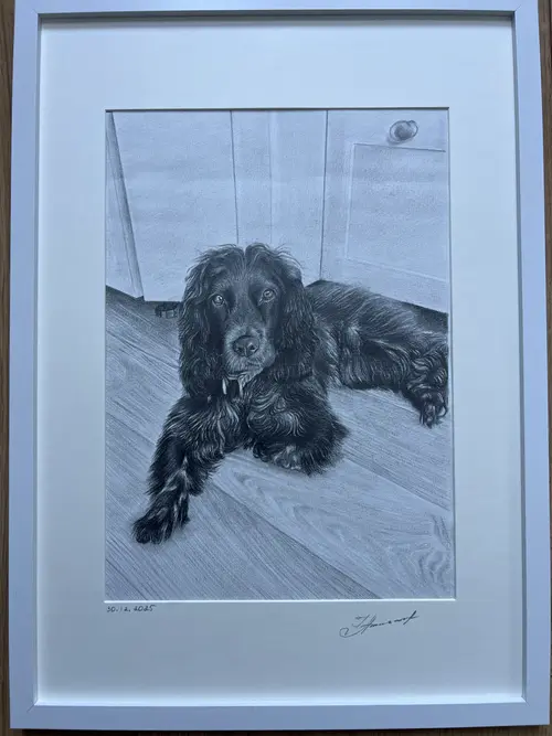 This hyperrealistic pencil portrait captures the soul of a beloved pet with striking precision and sensitivity. Every strand of fur, soft shadow, and reflective highlight has been meticulously rendered to preserve not only the dog’s physical likeness, but its unique presence and gentle spirit. Resting in a familiar home environment, the dog’s calm gaze conveys trust, loyalty, and quiet affection — a powerful reminder of the unconditional bond shared between pet and owner. The extraordinary level of detail elevates the drawing beyond representation, transforming it into a lasting tribute to companionship, love, and the everyday moments that make a pet truly irreplaceable. Signed and dated by the artist, this artwork is created to honour a precious member of the family — a timeless keepsake that preserves memory, emotion, and connection.