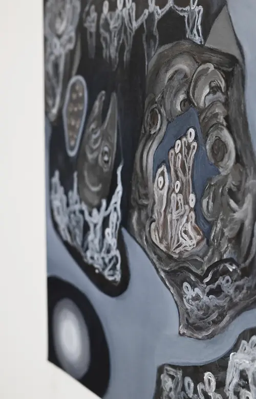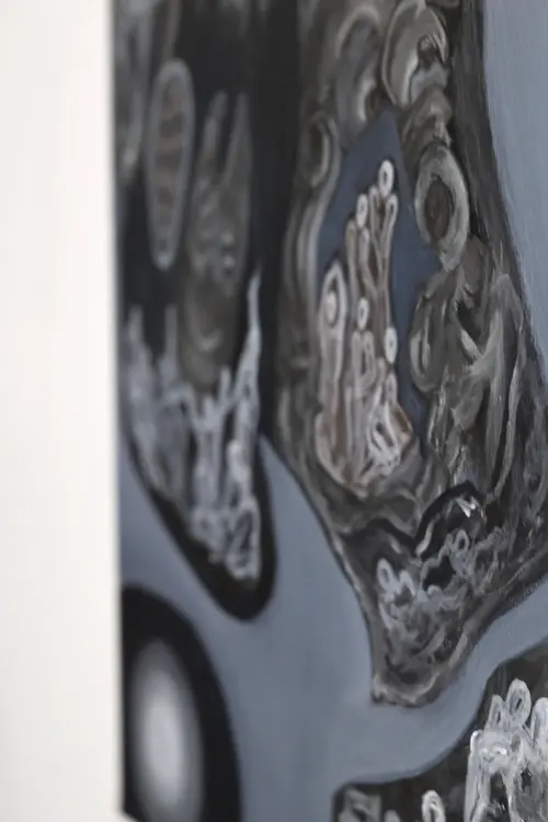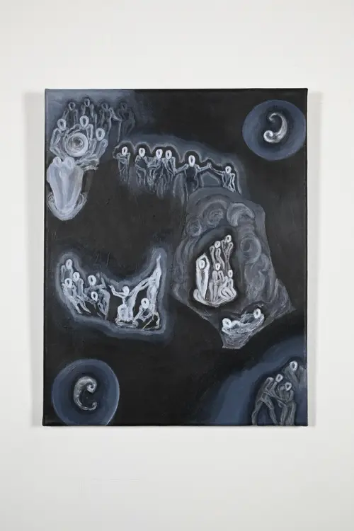 JADE MIKELL (b. 1996) is a disabled artist and activist. She lives on unceded Lək̓ʷəŋən land by way of unceded Taystayič. She earned her BFA with Distinction (cum laude) from the University of Victoria in 2023. Mikell works in painting, sculpture, installation, words, movement and (upcoming) sound to investigate subjects like inheritance, labour, hierarchy, social currency and sustainability through the lens of disability. Recent work has cited her upbringing in Anthroposophy and undergoing ABA therapy to emphasise the demoralising and endangering effects of institutional inaccessibility. Mikell often inspects the moral inadequacy assigned to disability in these environments through repurposing associated symbols and motifs, often posited to have curative effect. in production, Mikell locates supplies entirely from sources which interrupt the sequence of consumption and disposal; upcycled, salvaged, and repurposed materials. Mikell is interested in how accessibility and sustainability often conflict, and intends to question how we might practise sustainability and conservation without relying on exclusion. Jade Mikell’s work has been exhibited and collected internationally. Her work has been exhibited by Visionary Projects NYC, The Fifty Fifty Arts Collective, Audain Gallery, B.L.O.C.K.H.O.U.S.E. and more. Her most recent international solo exhibition, Vuelve, Oración en el Cielo opened earlier this year at Casa Lü—El Sur in México City, presenting Mikell’s research which compared how migratory birds and disabled bodies navigate climate instability. Her work has been published on ArtConnect, Behind Art (formerly Parrot), the Canadian Broadcasting Corporation and more. Awards for Mikell include a Canada Arts Council Explore and Create (Research and Creation) Grant, an Innovate Grant Honourable Mention and a MyMa Art Grant Honourable Mention.