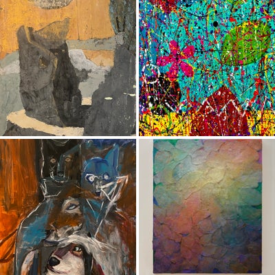 This dynamic and provocative painting brings together a powerful group of animals, with particular attention paid to the wolves and dogs. The layering of the figures adds depth and intensity, while the bold, textured brushstrokes convey movement and emotional complexity. The choice of earthy, contrasting tones – rich oranges paired with deep blues and blacks – create a striking visual effect, lending the scene an air of mystery and primal energy. The animals’ expressions are captivating, as if they are engaged in an intimate, silent communication. The blue-tinged wolf in the upper right corner, wide-eyed, brings an element of surrealism, drawing the viewer into a bizarre, symbolic narrative. There is an underlying tension between the wild and the domesticated, evident in the juxtaposition of the more familiar images of dogs and their wild counterparts. This hints at themes of instinct, survival and identity. This painting will be a fascinating addition to any contemporary art collection, appealing to those who appreciate both the primal energy of nature and the complexity of human-animal relationships. Its bold style and deep emotional intensity make it a work that will reveal new layers of meaning with every glance, capturing the attention in any space.