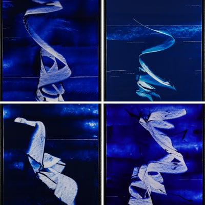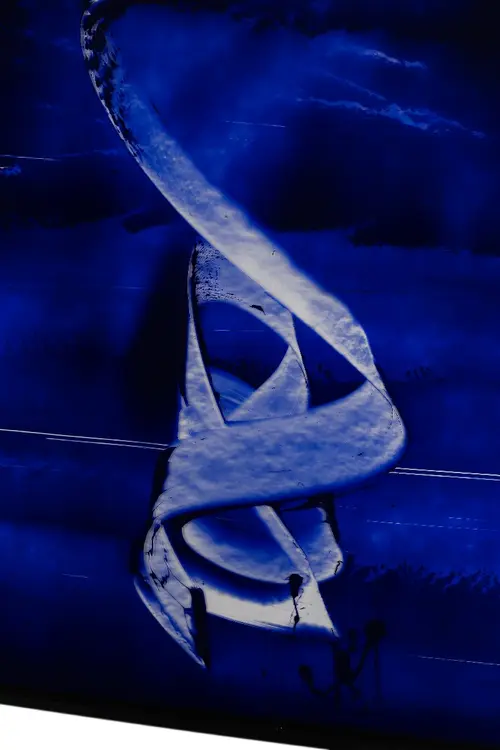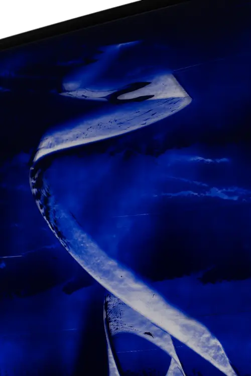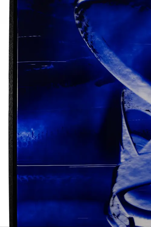 After working with cotton canvas, paper, and wood, Lancelot Blondeel explores a new painting surface: transparent canvas. This material choice, both technical and conceptual, opens a field of experimentation where light enriches the dimensions traditionally explored in painting. While opaque supports, especially in darker tones, tend to close the surface, the transparent canvas allows light to circulate, to pass through, reflect, and diffuse, revealing its many behaviors. Combined with acrylic paint and its translucent qualities, it produces vibrant, luminous effects. The ultramarine pigment, the keystone of the series, is thus revealed in all its depth and intensity. A tension also emerges between the carefully composed structure of each work and the spontaneity of the gesture. Impasto, projections, and brush thickness are studied and controlled, yet the gesture itself—an almost instantaneous physical act—remains instinctive, becoming a unique form of bodily language for the artist.