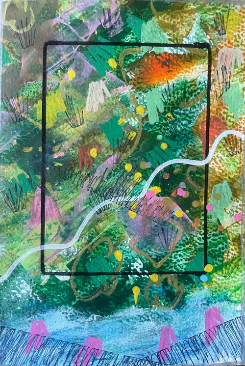 I paint using acrylics and collage elements in an attempt to create pieces that convey energy and motion.