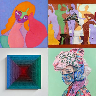 ‘Masquerade’ is painted on cradled wood panel in acrylic. It is varnished.
