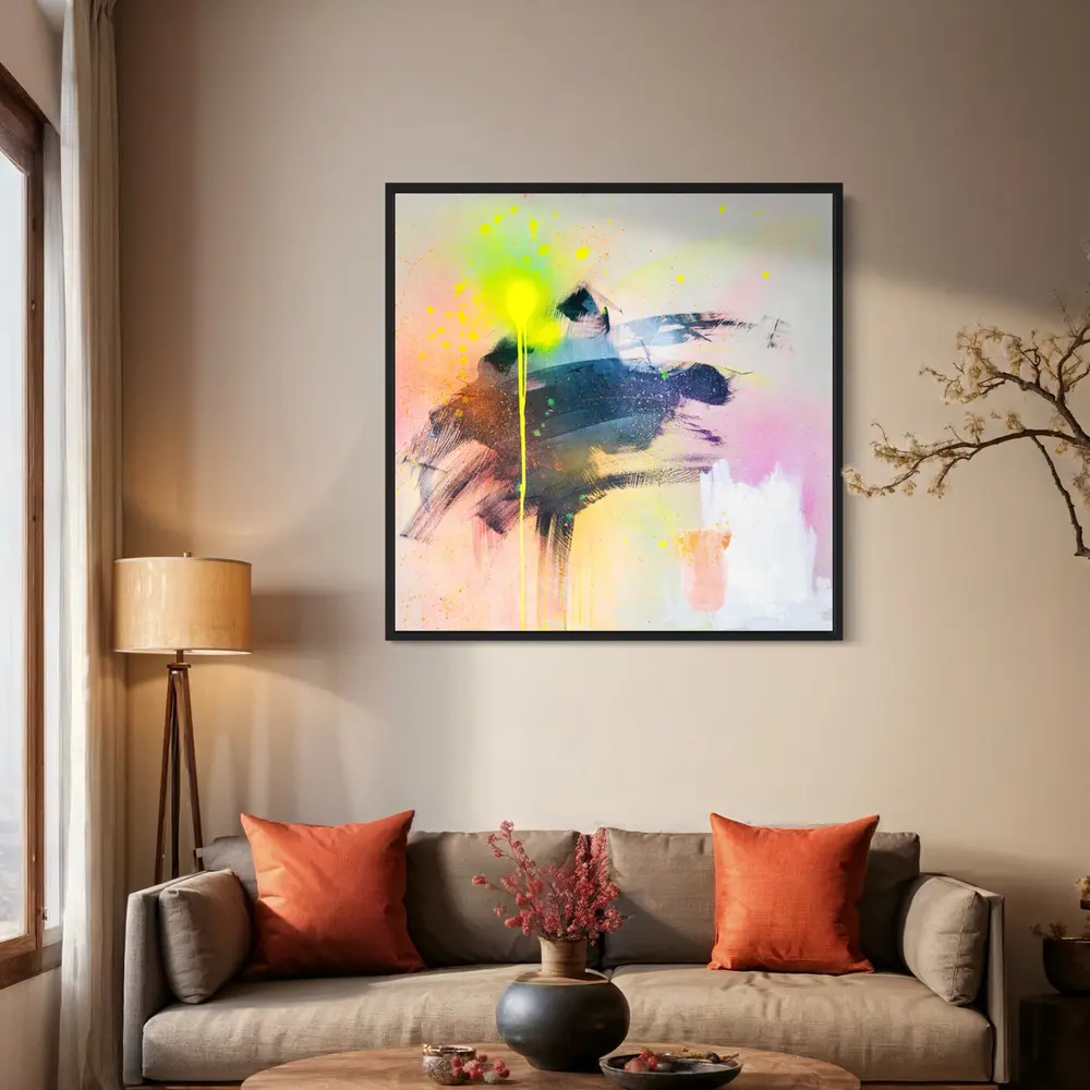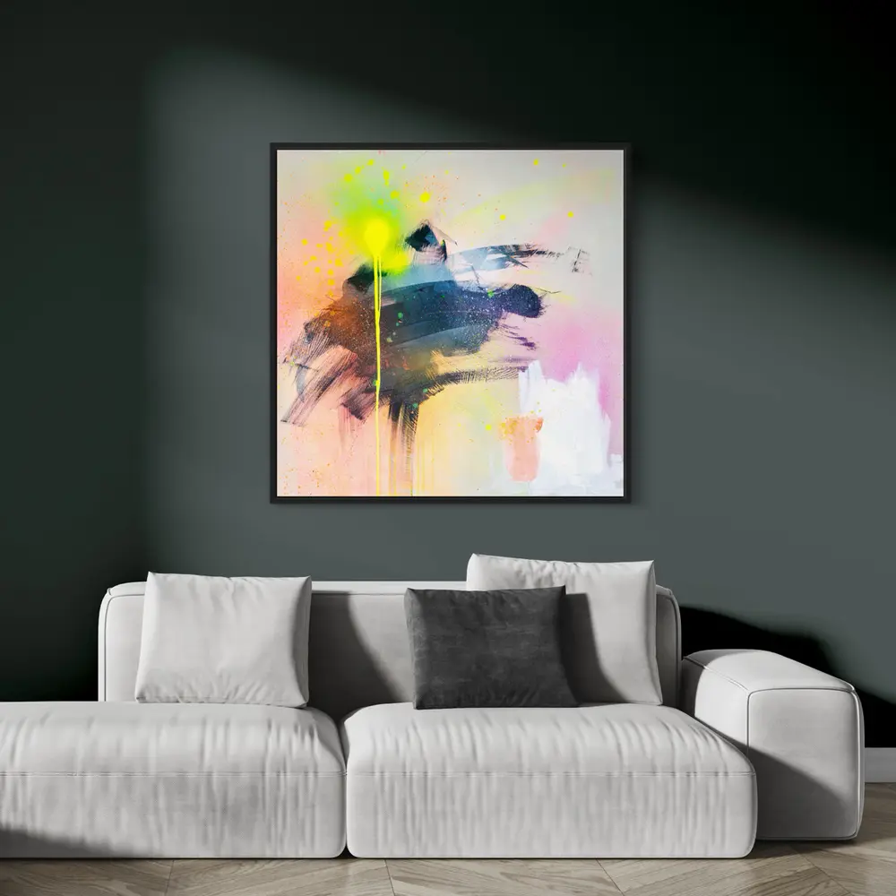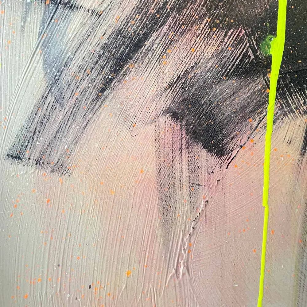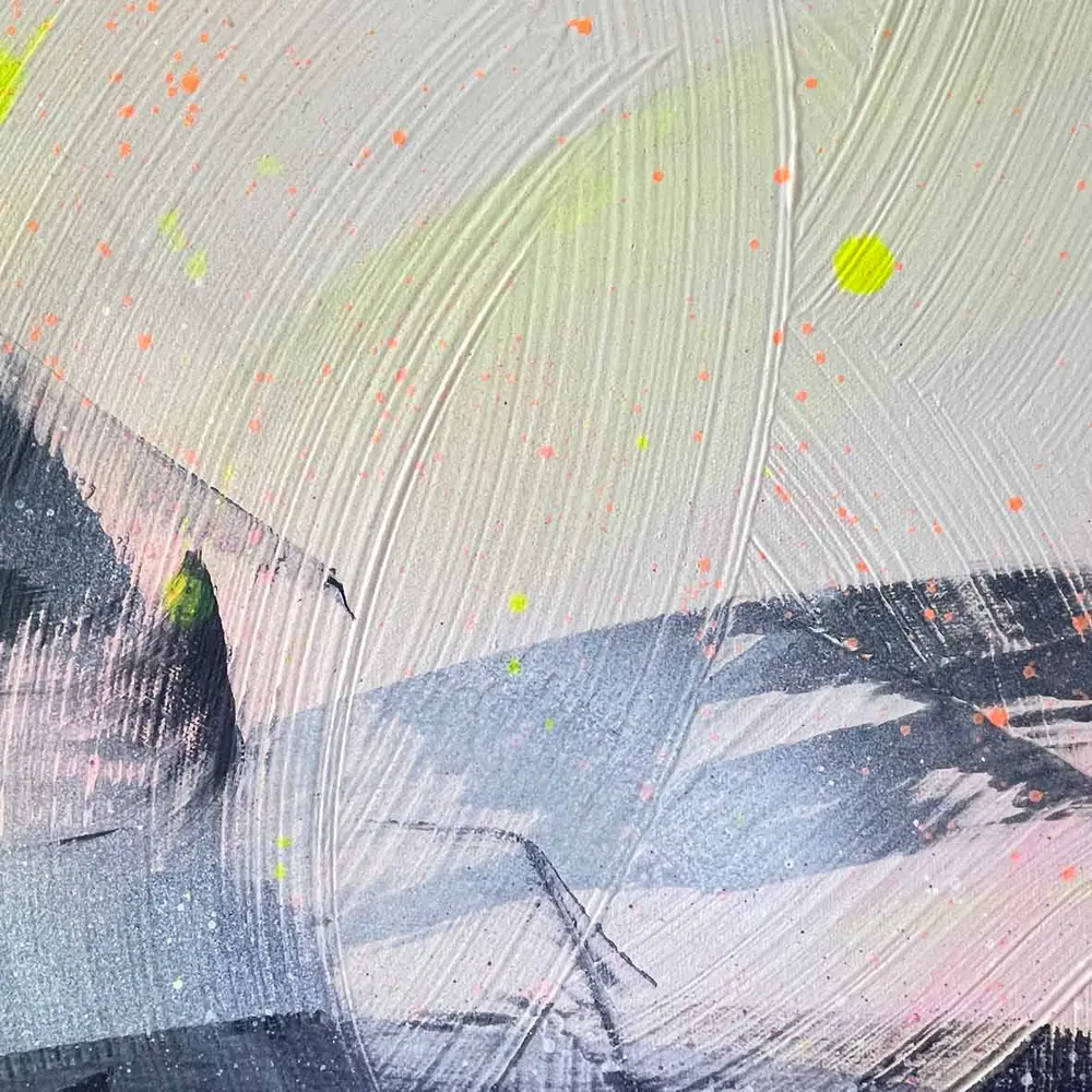 Inspired by a 6 hour trip to Miami, which felt like it was bursting with creativity. Every wall had colour, from the soft pastel hues of the art deco buildings to the enormous bold murals in Wynwood. This piece captures the dynamic and dichotic energy of being there, feeling the sun, sensing the creative vibe and drinking it all in. The painting features textured brushstrokes that add depth and dimension. Mayer’s use of softly sprayed layers introduces a subtle gradient effect, adding a dreamlike quality to the artwork. Neon highlights punctuate the composition, reflecting the vibrant nightlife and electric atmosphere of Miami. Bold strokes bring energy and movement to the piece.