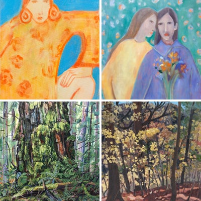 Karin Campbell’s paintings are loosely rendered, held together with the rhythm and balance of a drunken sailor. They teeter on the brink of collapse: clashing styles, alternating speeds, and bright colors lie underneath and/or on top of murky ones. Abstract shapes emerge suddenly as recognizable and allow unexpected associations and open-ended narratives. In the Pond, a large unstretched canvas, is presented in a way that is somewhere in between a traditional painting and a textile work, in a sense speaking to traditional quilt making. Like that process, the painting pieces together the artist’s reference points – memory, emotion, history, culture – through the varied marks Campbell uses, from applying paint with a brush to scraping away the surface, creating new textural surprises that serve to draw the viewer in. In her drawings, Campbell pares down this process. Using charcoal and the act of erasing, figures become entangled with themselves or others, emerging in the foreground with the ghostly remnants of where they started. Campbell’s source material is tied to memory and sensory experience. For the artist, the taking in of these reference points helps to activate the dark space between the trees.