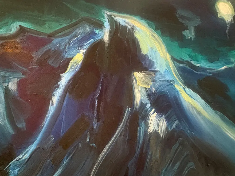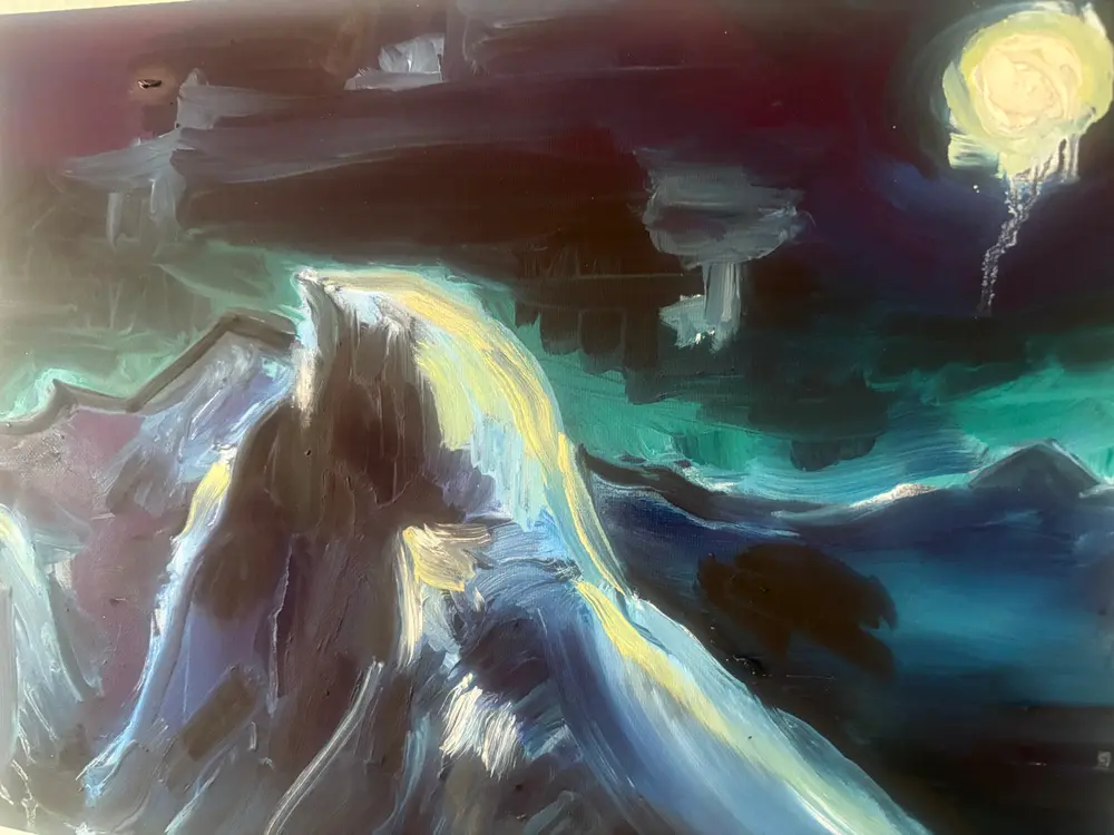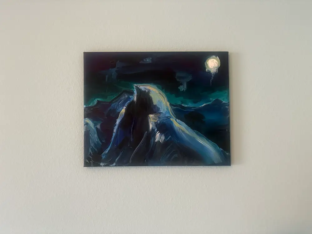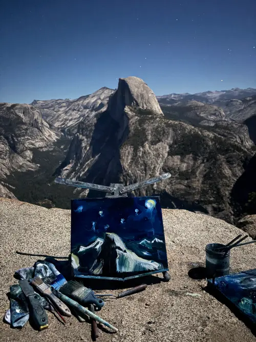 Harvest Moon visible over Half Dome from Glacier point. Painted overnight during government shutdown.
