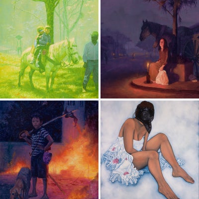 Within the thick foliage of the Amazon, coca leaves (acullico) pour forth from the thousands of shrubs that turn green, ocher, and yellow owing to the light penetrating the canopies. There, in the immensity of the shadows, powerful roots emerge—plants that, when ingested, cause alterations in states of consciousness, transmuting the perception of individuality, of being, and of the environment, reminding us that both the body’s inside and its outside are perceived and imagined at the same time. In this pictorial ensemble, Miguel Ángel Ríos presents a unique vision of himself via self-portraits that explore a fluid and constantly transforming “I,” which with each layer of paint ends up becoming unrecognizable, blurring the distinction between reality and imagination. In this sense, visual elements such as the face, the hat, and the scarf are configured in an amalgam of artistic styles, without any one element losing its own individual style within a composition that seeks to question the conventions of representation in a world governed by social media, and in which identity is characterized by being fixed and immutable. Apart from the light and shadows in Ríos’s visual landscapes, a range of colors is revealed that goes from dark to pastel tones. Fauna is present through lurking postures, operating as reminders, as with the ant that—with a subtle wink—recalls Operación Hormiga (Operation Ant), which is carried out by hand in order to pass coca leaves from one territory to another in southern Latin America, or with the figure of the scorpion that symbolizes a level of the unconscious, full of imagination and uncertainty. \- Mariana Camargo , Curatorial Coordinator Mixed media on paper