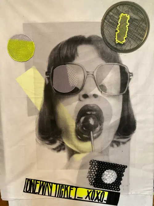 Collage . Flat print on fabric with some printed elements everything on painted canvas .