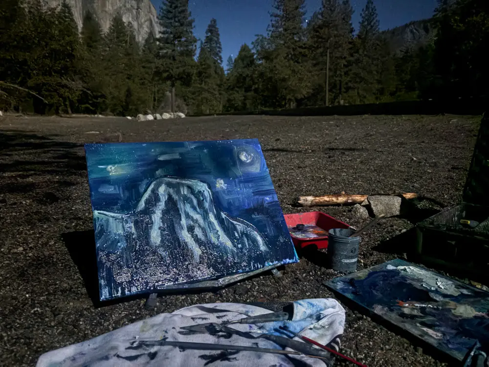 Standing watch over Yosemite Valley, the monolithic face of El Capitan- illuminated by the early rise of a full moon.
