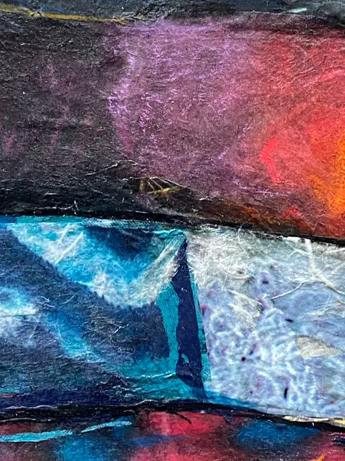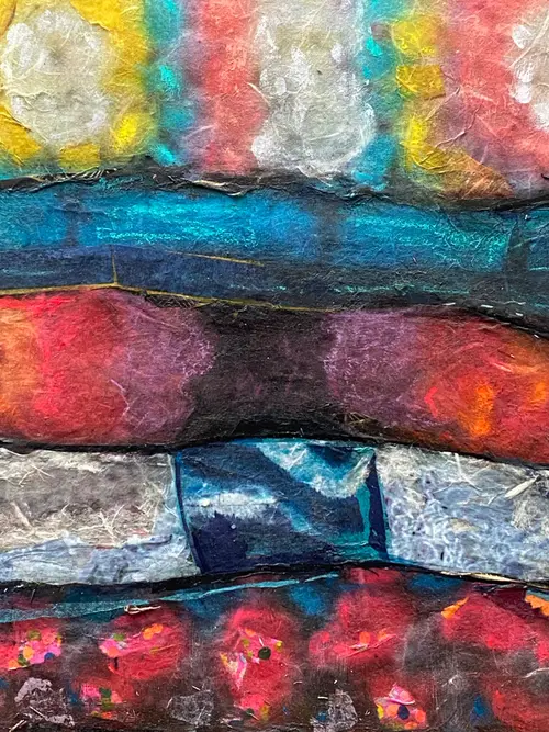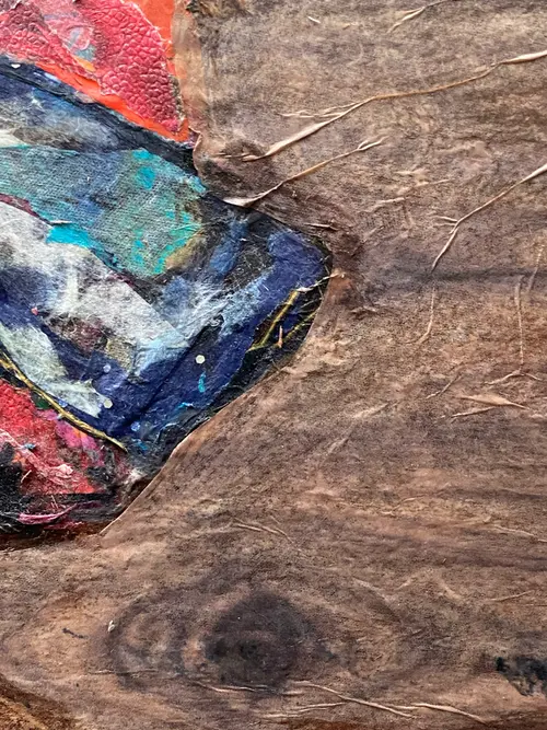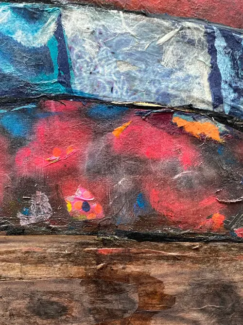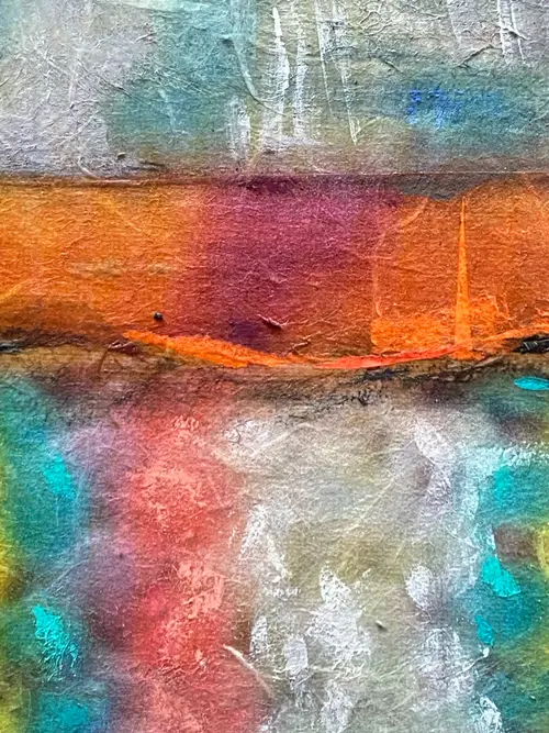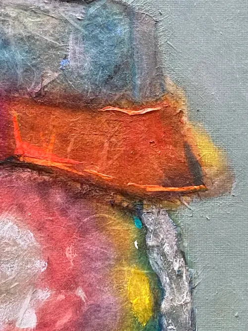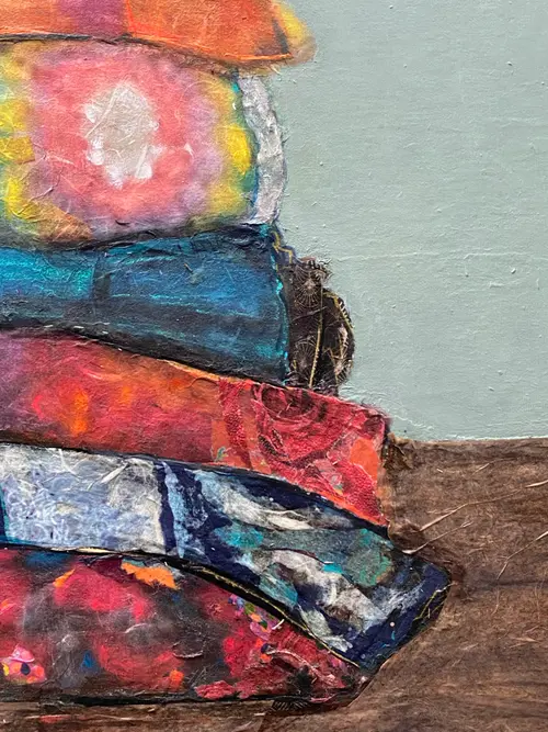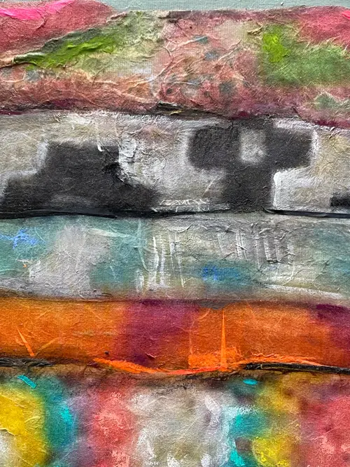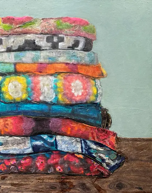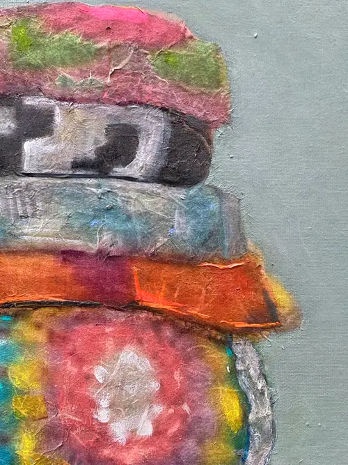 Nona 40 × 50 cm — Mixed Media on Canvas Panel Acrylic, pastel & collage · Varnished · Unframed Part of a growing series of layered textile-like forms—Nanna, Granny, Yia Yia—Nona continues this quiet lineage of domestic memory and warmth. Built from torn papers, painterly marks, and soft color fields, the stacked forms resemble folded blankets, heirloom fabrics, or well-loved quilts. Each layer carries its own history, yet together they create a gentle, grounding presence. The surface is rich and tactile, with visible fibers, edges, and seams that invite close viewing. Color moves between muted and vibrant—dusty blues, warm reds, softened greys—echoing the way memory itself fades and brightens over time. Created on a canvas panel and sealed with varnish, Nona can be framed with or without glass, allowing flexibility in presentation. It sits comfortably in both contemporary and traditional interiors, offering a sense of comfort, continuity, and quiet narrative.