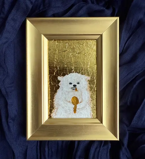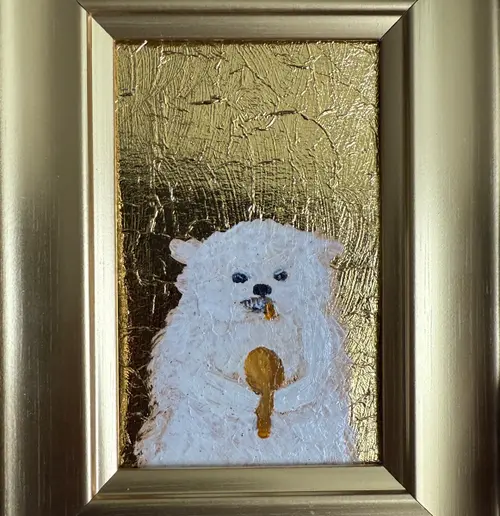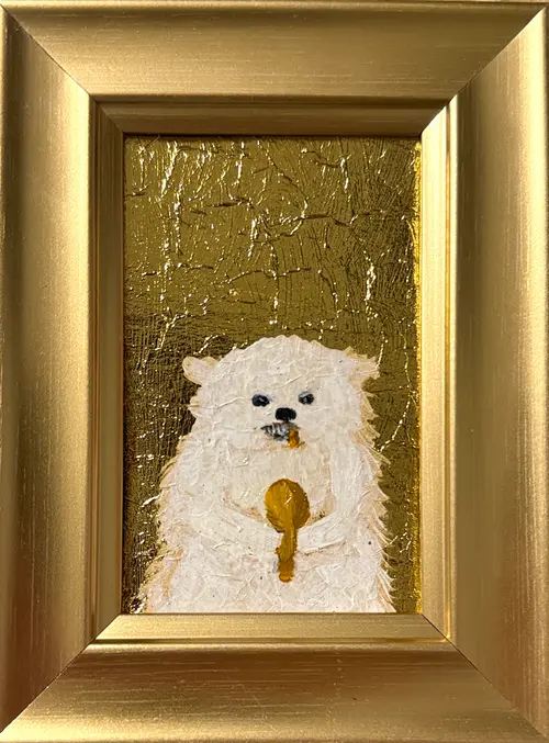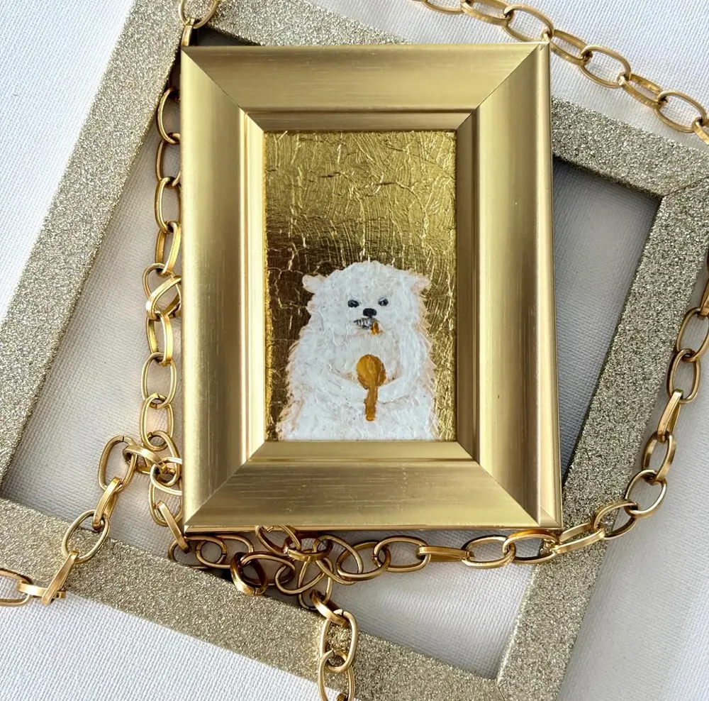 This is not your average fluffy pup — meet the little white Pomeranian who’s absolutely not sharing his chicken leg. Painted with rich oil paint on gold leaf background, this one-of-a-kind miniature artwork captures the dramatic stare of a spoiled dog with something to protect. Hilarious, charming, and slightly regal, this piece is the perfect statement for dog lovers with a sense of humor. ⸻ ❤️ Why You’ll Love It: • Unique original oil painting, not a print • Features a white Pomeranian gripping a chicken leg — cute and ridiculous in the best way • Background is genuine gold leaf, adding an elegant glow • Comes framed in a glossy gold frame — ready to display • A conversation starter and a gift that stands out ⸻ 🐾 Details: • Painting Size: 3.5” x 2” (8.9 x 5 cm) • Frame Size: 5” x 3.5” (12.7 x 8.9 cm) • Materials: Oil paint on high-quality paper with genuine gold leaf • Framed: Yes — gold frame included • Signed by artist on back • Ships securely packaged and ready to gift ⸻ ✨ Ideal for: • Dog lovers • Miniature art collectors • Humorous home decor • Desk art accent • Unique pet lover gift