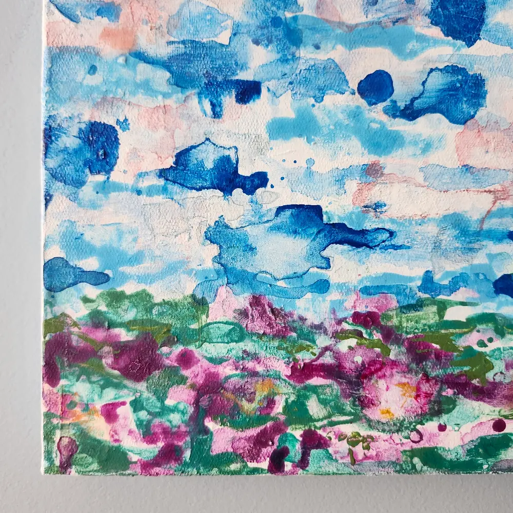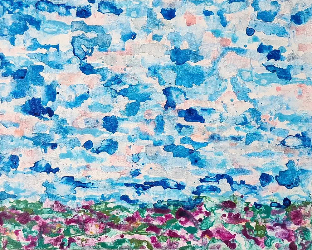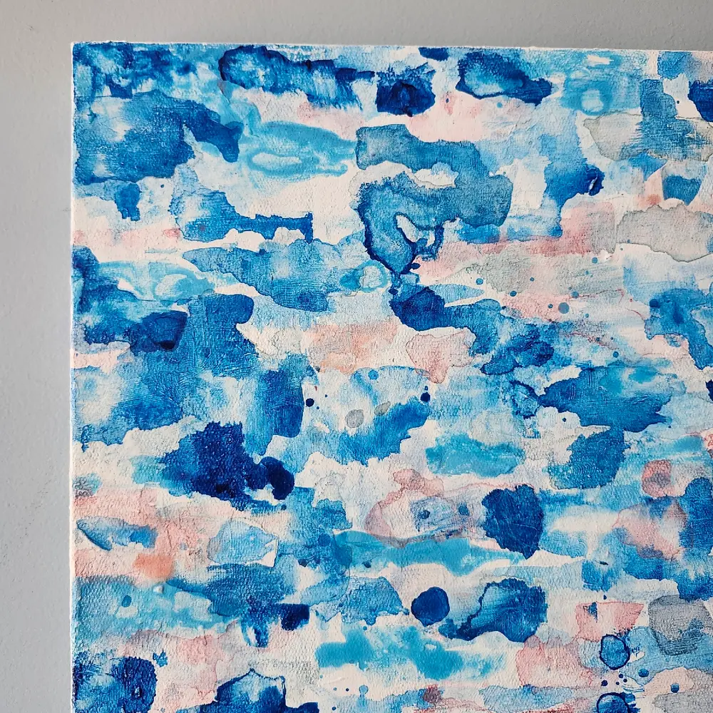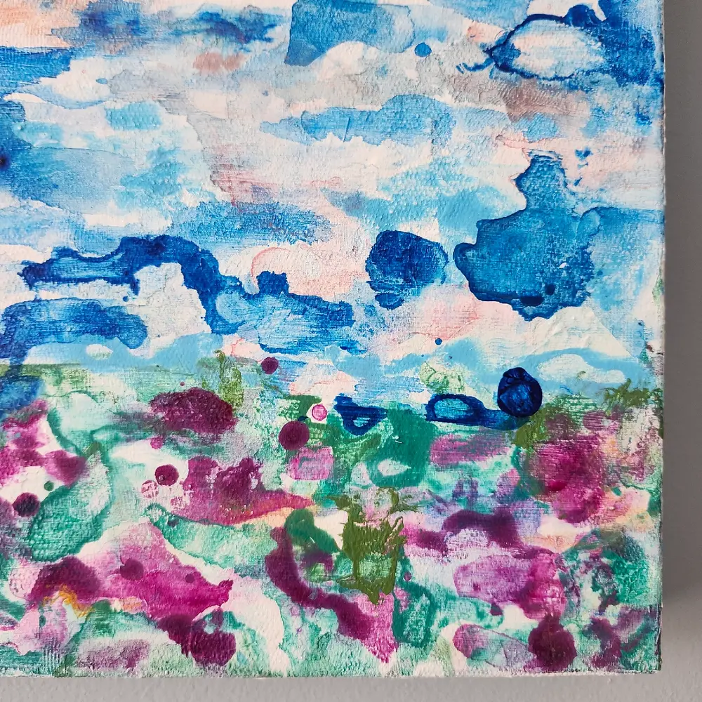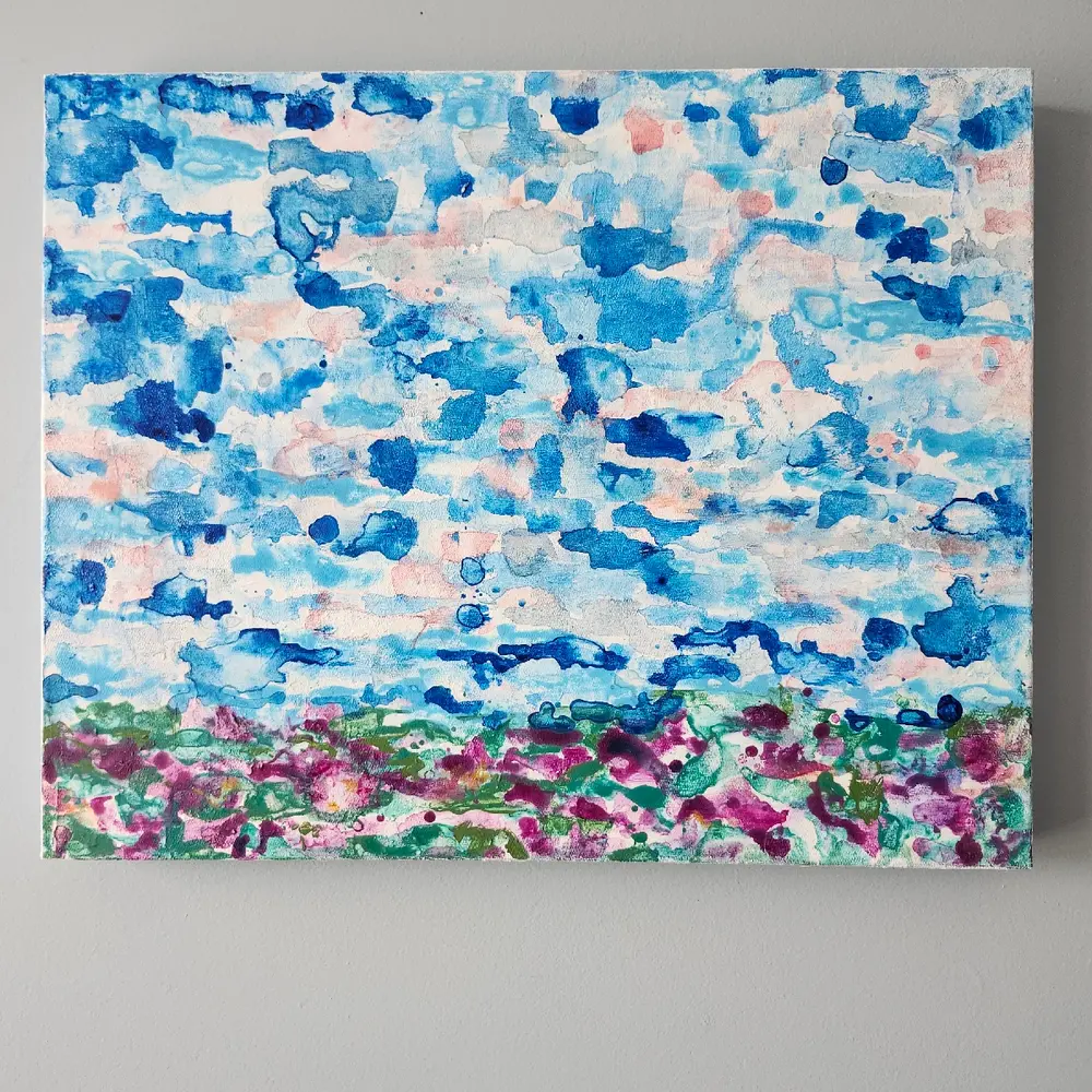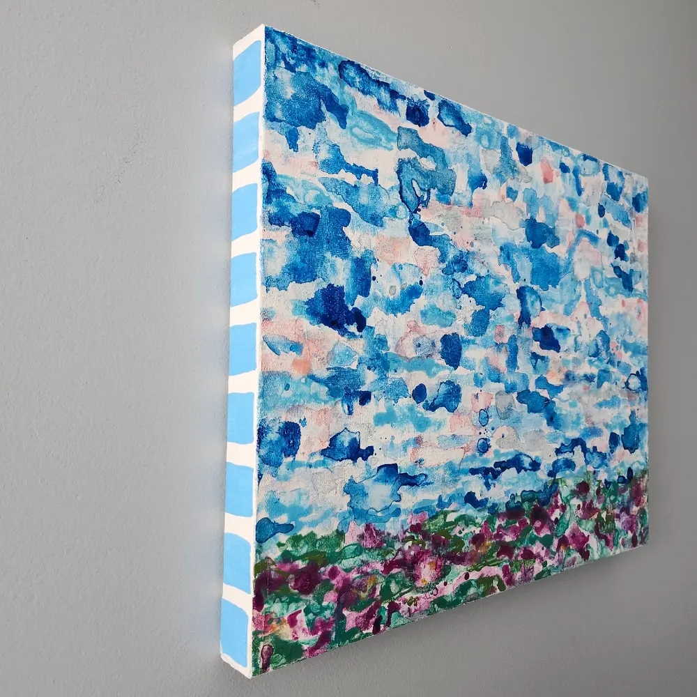 This piece captures the magic of stepping away from the expected and wandering into the unknown. It captures that refreshing lift you feel when you step off the worn path—where new sights spark inspiration and possibility. The airy blues, drifting whites, and gentle bursts of color mirror that sense of discovery, inviting you into a place where creativity and calm meet.
