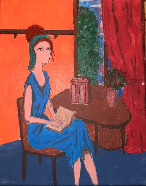 This painting portrays a solitary woman seated at a small table, absorbed in quiet reflection while holding an open book. The scene unfolds indoors, framed by a warm orange wall and deep red curtains, with a window revealing a glimpse of nature outside. The contrast between the intimate interior and the outside world creates a sense of emotional depth and stillness. The figure’s face is intentionally simplified, almost anonymous, inviting the viewer to project their own emotions and identity onto her. She is not a specific person, but a state of mind. The artwork explores themes of introspection, solitude, and inner life. The act of reading becomes a metaphor for self-discovery and contemplation — a pause from the noise of the outside world. The strong, contrasting colors reflect emotional tension: • Warm tones suggest comfort, memory, and intimacy • Cool blues evoke calm, melancholy, and quiet thought The closed, intimate setting emphasizes the idea that solitude can be a space of strength rather than loneliness. The woman appears grounded yet distant, physically present but mentally elsewhere a moment many viewers can recognize in themselves.