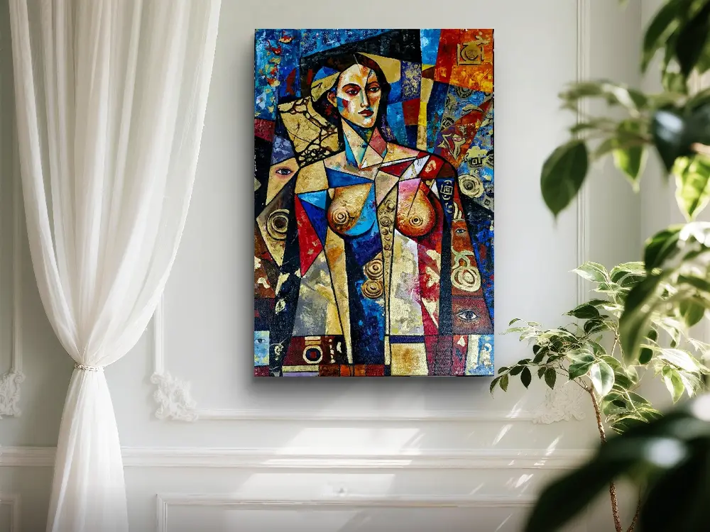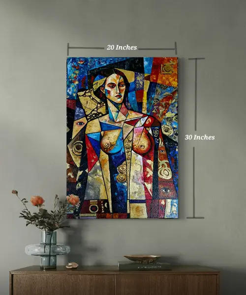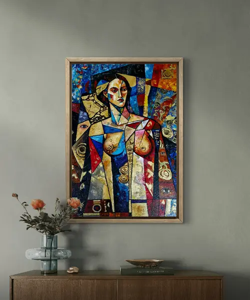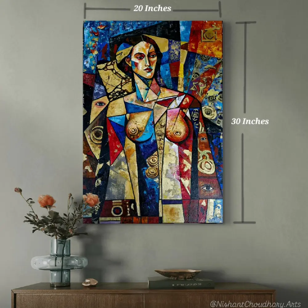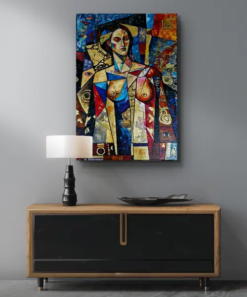 Perception examines how meaning is formed through observation. Fragmented planes and layered surfaces reflect the mind's way of assembling information. The figure functions as a structural element within the composition, directing focus toward awareness, interpretation, and the relationship between viewer and image.