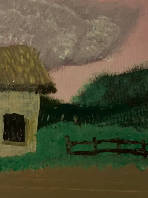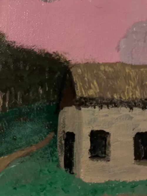 Hand painted on a thin canvas and farmed for easy hanging. Medieval house and fence with a pink sky in the background.