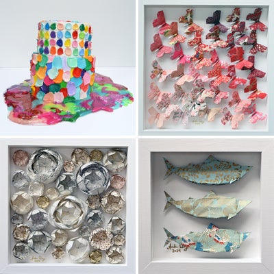 Collaborative Cake sculpture by Betsy Enzensberger and Ann Marie Coolick. 7.5" tall x 15 x 13. Oil and resin on custom wood panels. Bottom tier cake diameter is 6.5" wide.