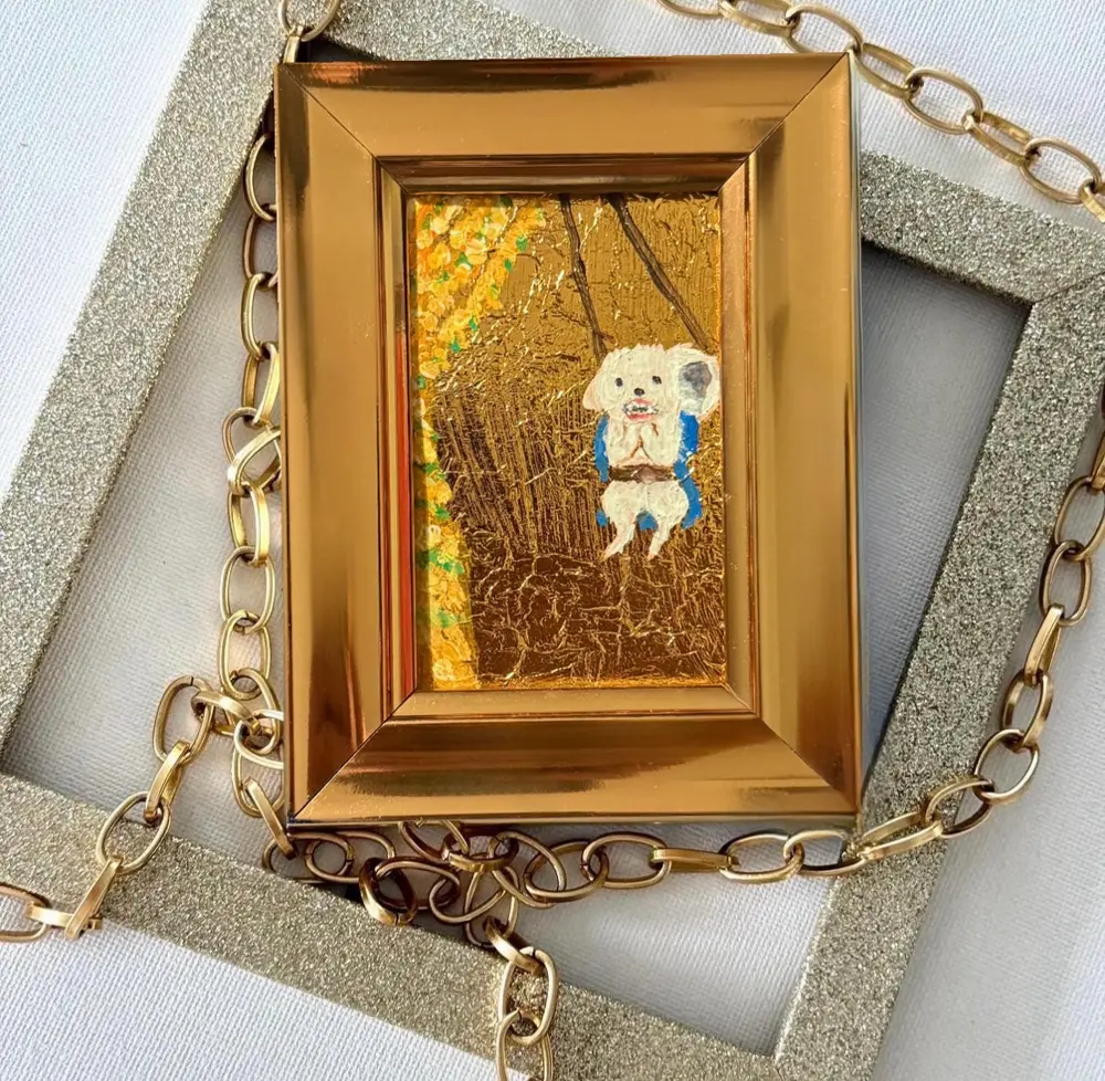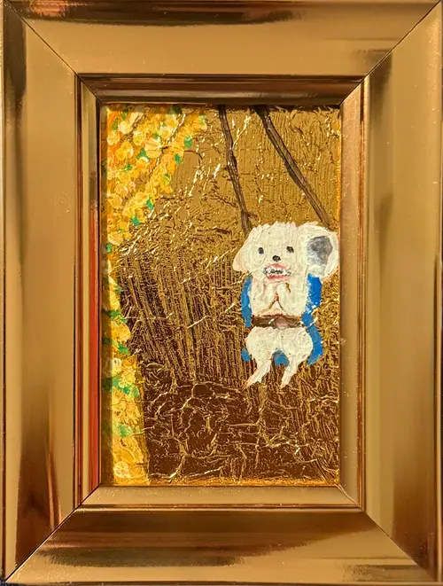 Adorable and whimsical — this one-of-a-kind miniature painting features a fluffy white dog on a swing, hand-painted in oil on a background of genuine gold leaf. Framed in a metallic copper frame that enhances the warm tones and playful charm of the piece. 📌 Details • Size (without frame): 3.5 x 2 in With frame 5 x 3,5in • Materials: oil paint, genuine gold leaf, paper • Frame: metallic copper tone, included • 100% original artwork — not a print or reproduction • Varnished for protection • Signed by the artist on the back • Ready to display or gift ⸻ • Painted entirely by hand — no digital work or prints • Features a fluffy white puppy on a swing — joyful, emotional and quirky • Gold leaf background adds a luminous, elegant texture • Compact size, perfect for small wall spaces or desk displays • Great conversation piece or whimsical art gift ⸻ 🎁 Perfect for: • Dog lovers • Miniature art collectors • Whimsical home or office decor • Unique handmade gift seekers