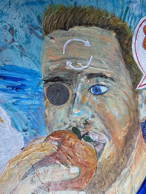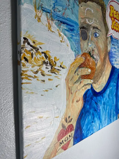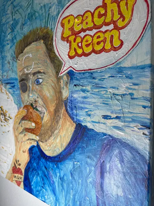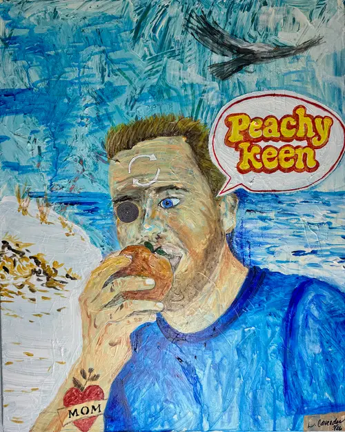 A bold “Peachy Keen” speech screams classic optimism, but the hypnotic spiral eye, forehead refresh loop, and that slightly dazed bite into the peach tell a whole different story—like someone desperately hitting “reload” on their good mood while a crow circles overhead and Mom’s heart tattoo keeps watch. It’s ironic, modern, and just a little unhinged…