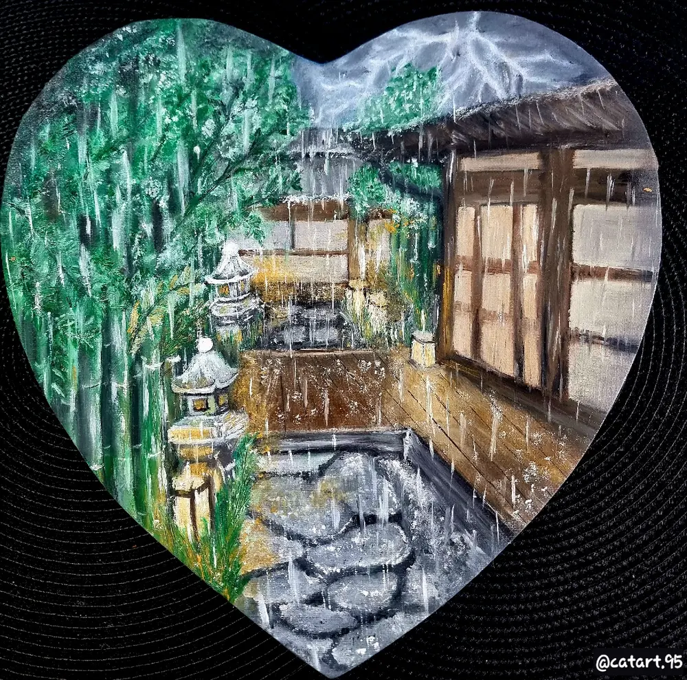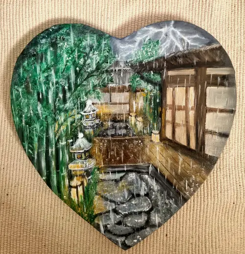 I created this painting after the birth of my son. After a year-long hiatus, picking up the brush again was an elevating feeling: though I am no longer the same person I was before giving birth, painting reminded me of who I was and affirmed my desire to continue. The bamboo grove and the Japanese-style building in the rain symbolize a quiet sanctuary where the soul can rest and regain strength. The image carries the promise of newfound creativity and continuity for me.