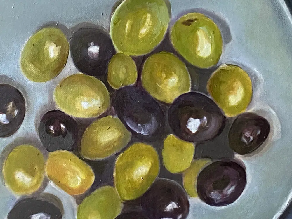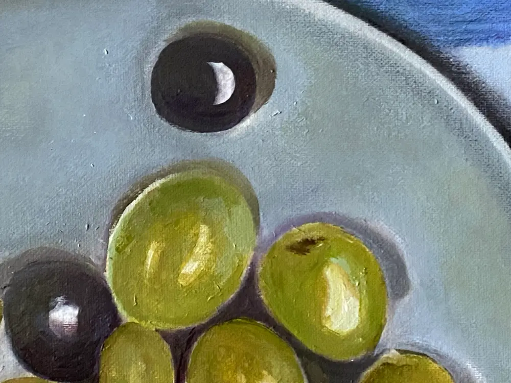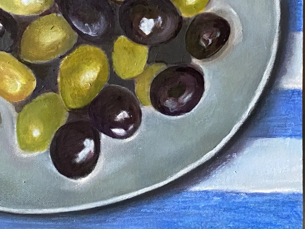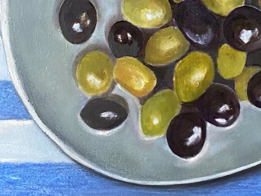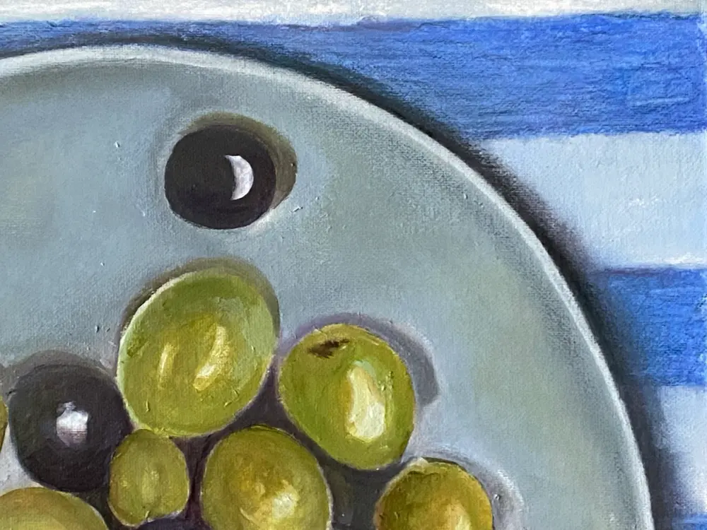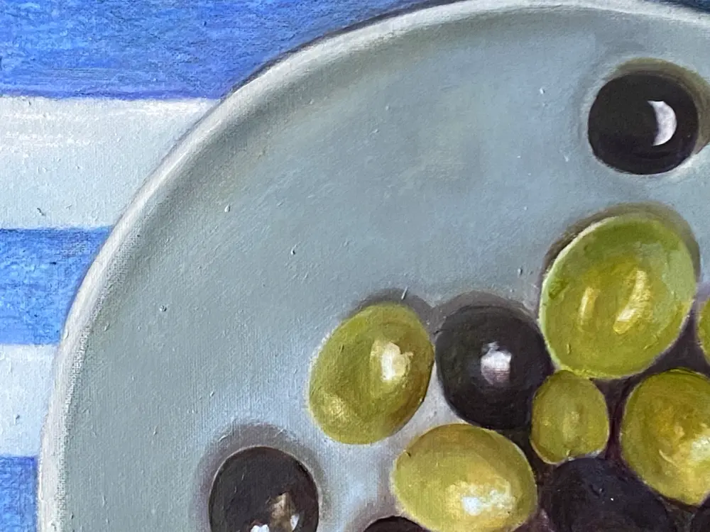 Santorini is an original still life painting inspired by the quiet light and restrained beauty of the Greek islands. Green and dark olives rest on a pale ceramic plate set against soft blue and white stripes, evoking the calm of a shaded Mediterranean table and the slow rhythm of coastal summer afternoons. The composition balances simplicity and atmosphere, allowing colour, light, and silence to carry the emotional weight of the scene. The work is painted in acrylic and pastel on canvas panel, creating gentle tonal layering, subtle texture, and luminous highlights across the fruit and ceramic surface. A protective varnish enhances depth and preserves the pigments. This is a one-of-a-kind original artwork, signed on the back. Dimensions: 40 × 40 cm. A contemplative Mediterranean still life for collectors drawn to light, stillness, and the poetry of everyday objects.